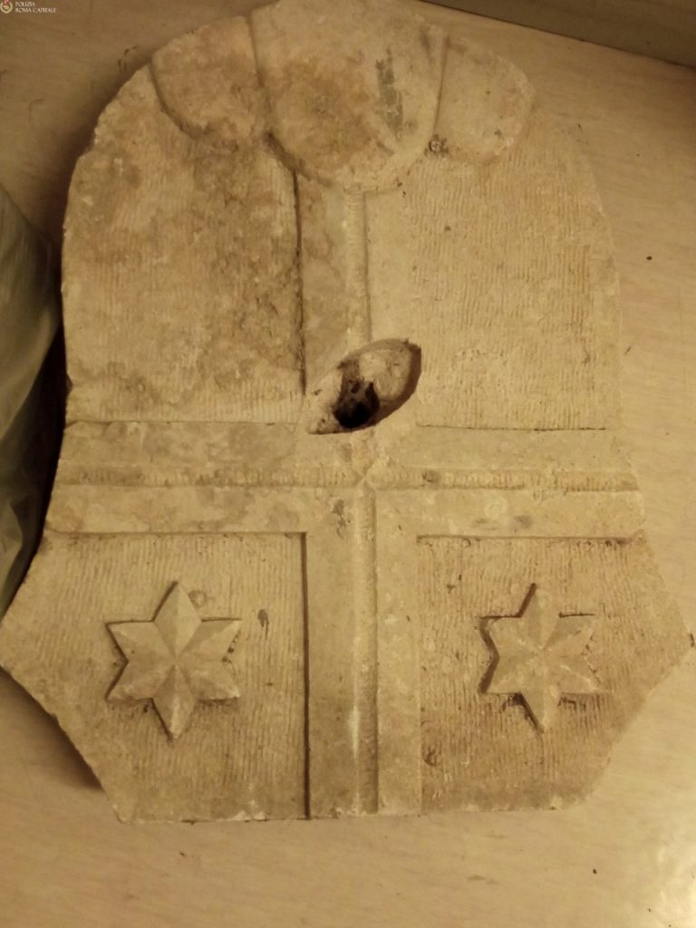 Gli agenti, recatisi sul posto, hanno verificato la presenza di un reperto, di forma semi trapezoidale, che presentava in bassorilievo una croce e due stelle a sei punte sulla base, con un foro ovoidale al centro. Sul retro erano evidenti due supporti cilindrici cavi.