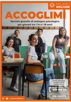 A Milano è attivo lo sportello psicologico AccogliMI, il progetto di sostegno per giovani dai 14 ai 18 anni – e per i loro genitori – realizzato in collaborazione con ATS, “Rete delle scuole che promuovono salute”, finanziato dal Comune di Milano e gestito da una rete di Enti del terzo settore, che offre ai ragazzi percorsi gratuiti di recupero del processo evolutivo in caso di difficoltà, malessere o disagio. Il progetto, avviato nel biennio 2021-2022, proseguirà anche nel biennio 2022-2023.