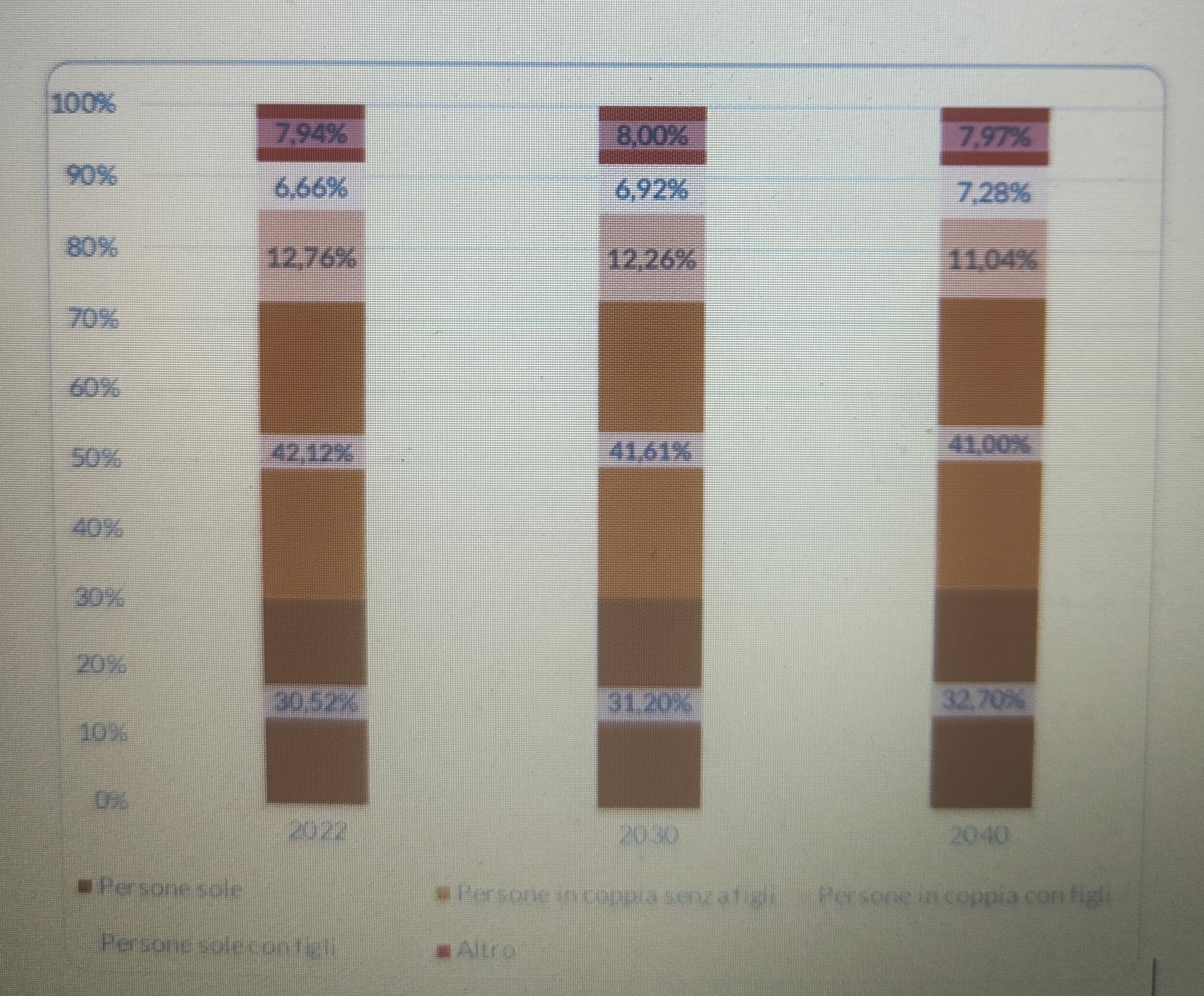 Al primo gennaio 2022, il maggior numero di ultrasessantacinquenni vive in coppia senza figli (42,1%), quelli soli sono il 30,5%, quelli in coppia che vivono con i propri figli sono il 12,8% mentre i nuclei monogenitore con figli sono il 6,7%. Le tendenze di breve e medio periodo mostrano un progressivo incremento percentuale delle persone sole che dovrebbero salire al 31,2% nel 2030 e al 32,7% nel 2040. Tra meno di vent’anni, un Silver su tre vivrà da solo.
