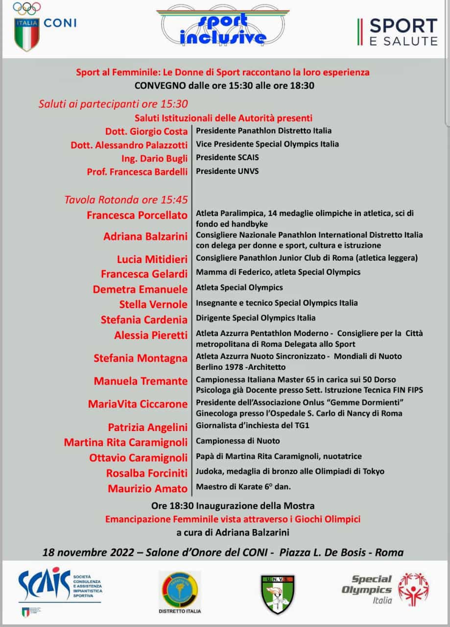 Nel segno delle donne che fanno sport  le quattro associazioni Benemerite del CONI, Panathlon, Unione Nazionale Veterani dello Sport, Special Olympics e Scais, hanno preso parte all’evento del Coni dedicato a “Progetto Sport Inclusive” di Sport e Salute per mettere in rilievo la possibilità di includere, attraverso la pratica sportiva e le corrette abitudini nell’alimentazione e nella cura della forma fisica, in particolare le donne, ma anche gli over 60.