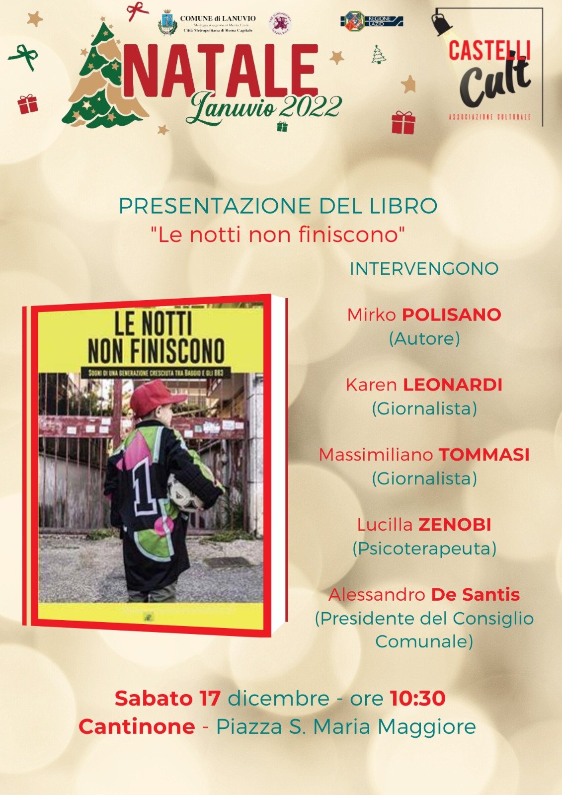 All’interno del calendario degli eventi previsti per il Natale Lanuvino c’è nuovamente spazio per la cultura. Sabato 17 dicembre, infatti, Lanuvio ospiterà il giornalista Mirko Polisano per la presentazione del suo libro “Le notti non finiscono”. All’incontro con l’autore, organizzato in collaborazione con l’Associazione “Castelli Cult” parteciperanno il Presidente del Consiglio comunale e delegato alla cultura del Comune di Lanuvio Alessandro De Santis, i giornalisti Karen Leonardi e Massimiliano Tommasi e la psicoterapeuta Lucilla Zenobi.