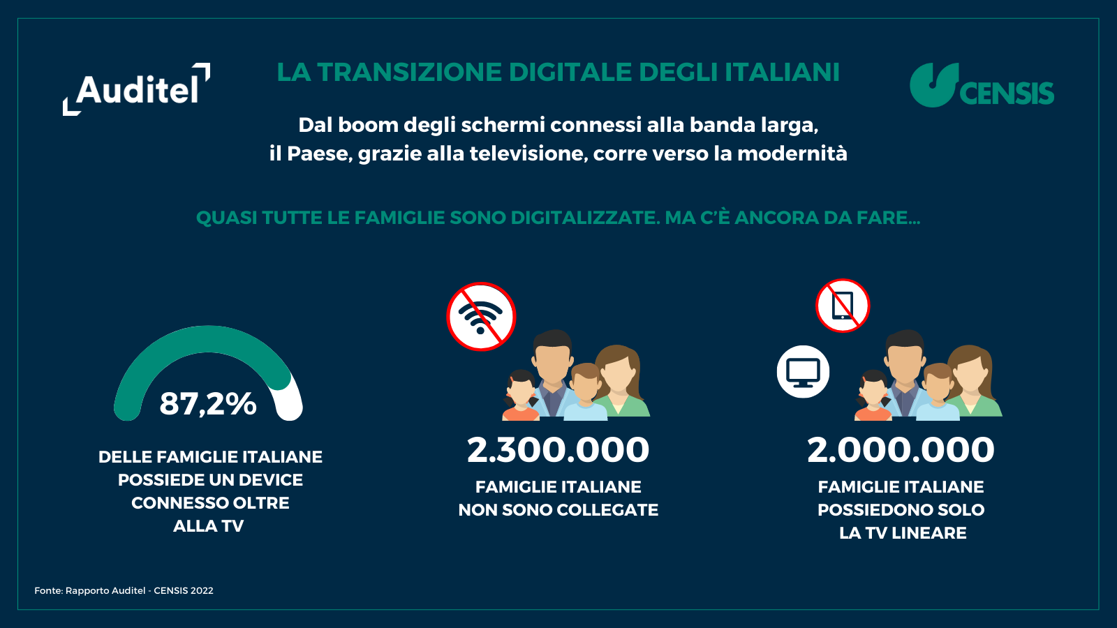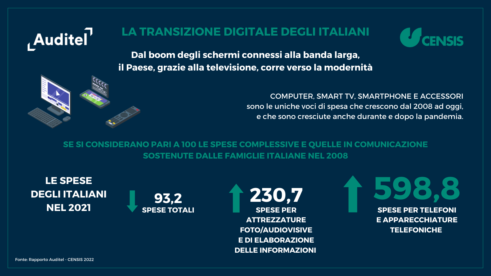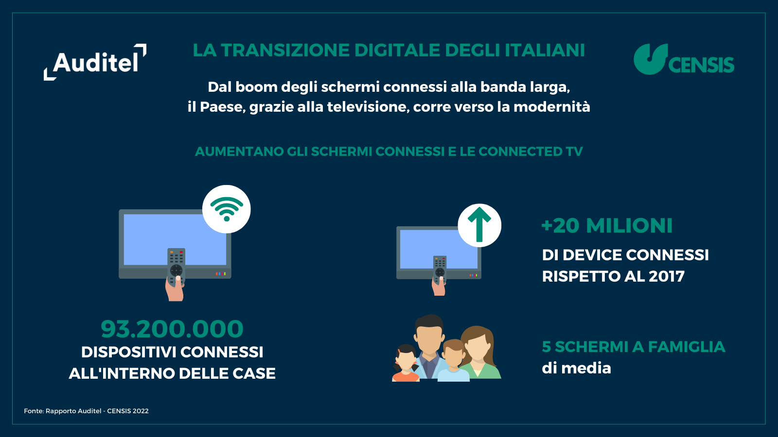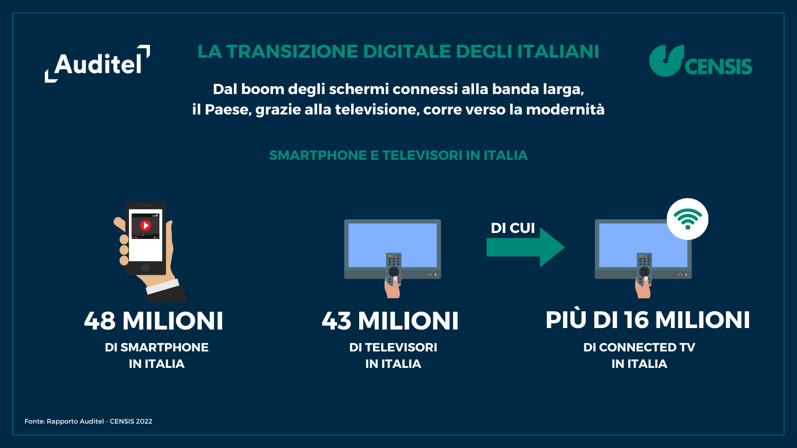 Dal Quinto Rapporto Auditel-Censis emergono, come ha spiegato il Presidente di Auditel, Andrea Imperiali, “la centralità della TV che fa da motore al processo di trasformazione del Paese in chiave digitale; una crescente adesione alla banda larga, che si configura sempre più come bene di prima necessità e non più accessorio e che sotto la spinta del PNRR avrà uno sviluppo decisivo; un ulteriore aumento delle dotazioni (in particolare degli smartphone e delle Smart TV) che innalza il numero degli schermi connessi al picco di circa 100 milioni”.