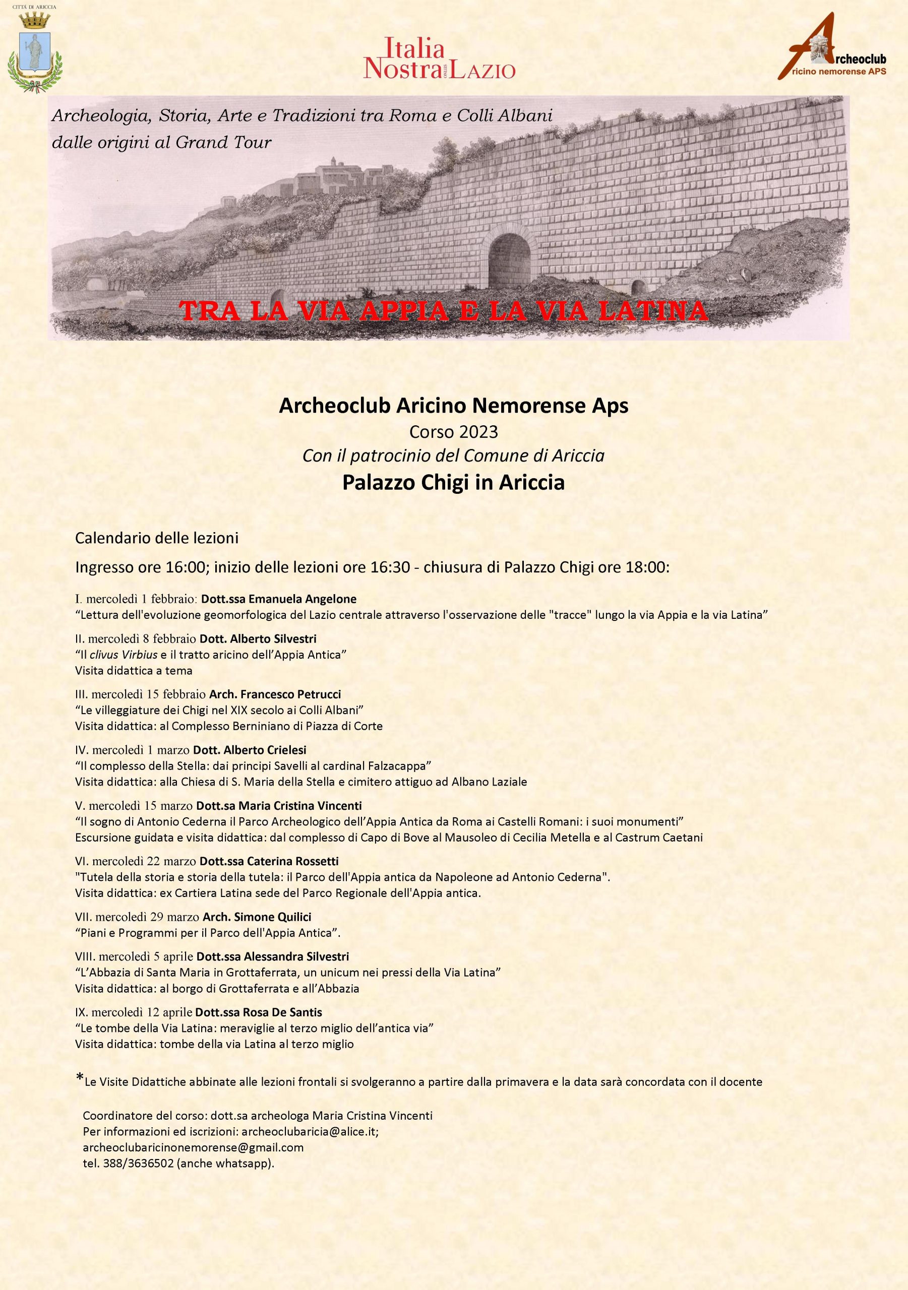 L’Ente per il 2023 ha messo a punto un programma di iniziative culturali, con avvio dal prossimo gennaio, tra cui un interessante Corso di Archeologia e Storia dell’Arte “Tra la via Appia e la via Latina”, che si svolgerà, per quanto riguarda le lezioni frontali, nella prestigiosa sede di Palazzo Chigi dal mese di febbraio. Il Corso 2023 è patrocinato dal Comune di Ariccia e da Italia Nostra Lazio e prevede una serie di visite didattiche ai siti archeologici, artistici e religiosi che saranno oggetto delle lezioni.