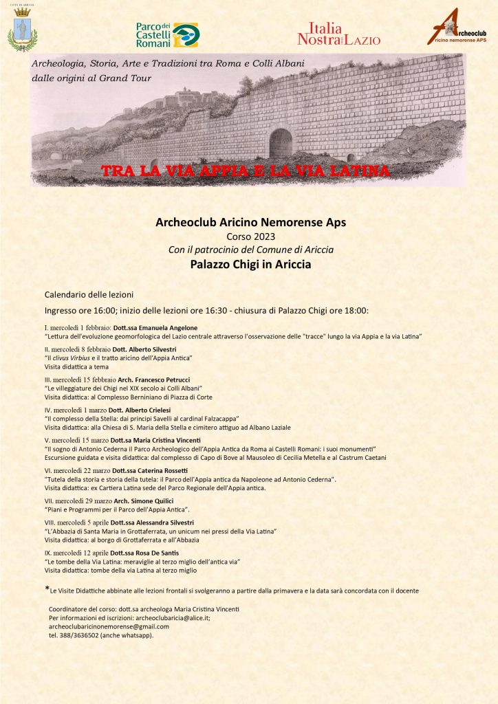 Come di consueto si svolgerà anche quest’anno l’ormai tradizionale corso di Archeologia arte e tradizioni tra Roma e Colli Albani iniziato nel 2015 e promosso da Archeoclub Aricino Nemorense aps. L’edizione 2023 avrà come tematica di approfondimento “TRA LA VIA APPIA E LA VIA LATINA” ed è patrocinata dal Comune di Ariccia, da Italia Nostra Lazio e dal Parco dei Castelli Romani.