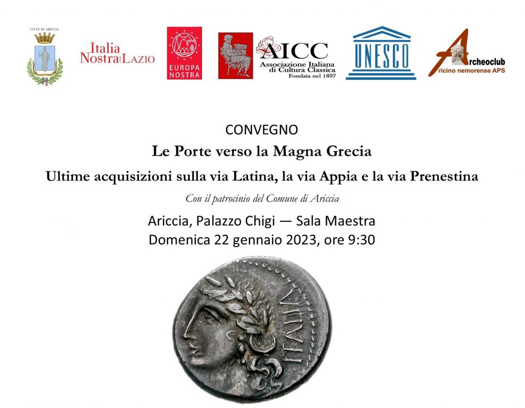 ARICCIA, IL 22 GENNAIO IL CONVEGNO “LE PORTE VERSO LA MAGNA GRECIA: ULTIME ACQUISIZIONI SULLA VIA LATINA, LA VIA APPIA E LA VIA PRENESTINA”.