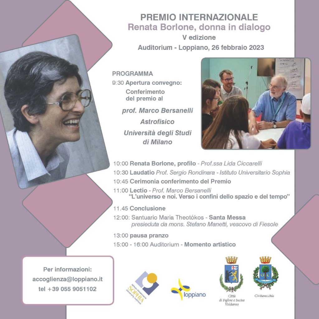 (MeridianaNotizie) Roma, 25 febbraio 2023 – Domenica 26 febbraio a Loppiano (FI), consegna del Premio Internazionale “Renata Borlone, donna in dialogo” assegnato a scienziati che si sono distinti nella ricerca.  Quest’anno il riconoscimento viene conferito al professor Marco Bersanelli, ordinario di Fisica e Astrofisica all’Università degli Studi di Milano, studioso del cosmo e della luce primordiale generata dal Big Bang. Il consigliere Pasquale Marino, su delega del sindaco, sarà presente a rappresentare il Comune di Civitavecchia, che patrocina il Premio insieme al Comune di Figline e Incisa Valdarno. Con questo premio, infatti, giunto alla quinta edizione, si vuole ricordare la figura della nostra concittadina (Civitavecchia 30.5.1930 – Loppiano 27.2.1990) che ha speso la sua vita per l’aiuto al prossimo avendo come ispirazione e riferimento la fede cristiana, vissuta alla luce della “spiritualità dell’unità” di Chiara Lubich, e un amore per la scienza vista come possibile strumento «per l’unità della famiglia umana». Non a caso, commentando la notizia, il professor Bersanelli ha spiegato come il premio colga un aspetto per lui importantissimo: «Il desiderio che la bellezza sorprendente della Creazione, che piano piano si svela grazie alla ricerca scientifica, sia una nuova e più profonda possibilità di lodare il Creatore».