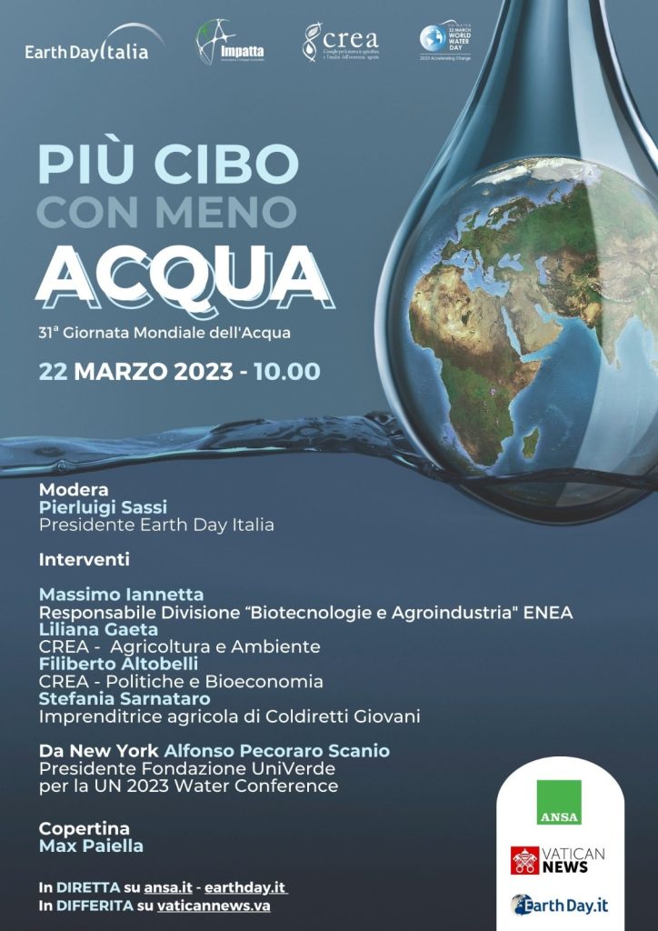 In occasione della 31a Giornata Mondiale dell’Acqua, a poche ore dall’apertura della UN 2023 Water Conference di New York, Earth Day Italia in collaborazione con Impatta e il CREA, il più importante ente italiano di ricerca dedicato all’agroalimentare, organizza un digital talk in diretta ANSA dal titolo “Più cibo con meno acqua”, dalle ore 10.00.