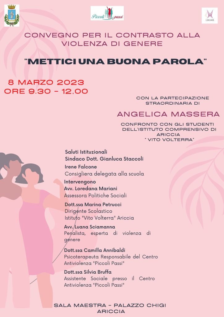 All’evento parteciperanno il Sindaco di Ariccia Gianluca Staccoli, la Consigliera alle scuole Irene Falcone, l’Assessora alle politiche sociali Avv. Loredana Mariani, la Dirigente Scolastica Professoressa Marina Petrucci, nonché l’Avv. Luana Sciamanna esperta di violenza di genere, La Dott.ssa Silvia Bruffa assistente sociale e la Dott.ssa Camilla Annibaldi responsabile del Centro Antiviolenza “Piccoli passi” che ha sede ad Ariccia.