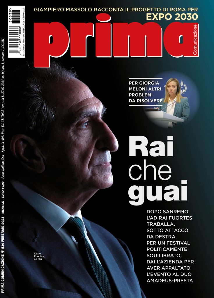 RiIl 539esimo numero di Prima Comunicazione è da oggi, giovedì 2 marzo, nelle edicole di Milano e da venerdì 3 marzo sarà in quelle di Roma. In questa edizione, a guadagnarsi la copertina di Prima è la Rai, che dopo essere stata protagonista del successo del Festival di Sanremo è andata sotto attacco dei partiti di Governo. La foto di copertina rappresenta molto bene lo stato d’animo dell’ad Carlo Fuortes, che deve fare i conti con un’azienda agitata come succede sempre a viale Mazzini quando il cambio di Governo fa immaginare cambiamenti di poltrone e di ruoli di potere.