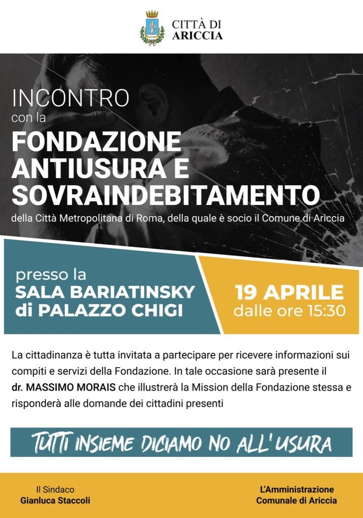 Mercoledì 19 aprile, alle ore 15.30 si svolgerà ad Ariccia, all’interno della Sala Bariatinsky di Palazzo Chigi , un incontro con la Fondazione Antiusura e Indebitamento della Città Metropolitana di Roma, della quale è socio il Comune di Ariccia. All’iniziativa prenderà parte il dr. Massimo Morais, che illustrerà ai presenti la mission della Fondazione , ponendosi come obiettivo primario l’informazione , l’orientamento , l’assistenza e le prestazioni di garanzia per i cittadini. “Si tratta- spiega l’Assessore ai Servizi Sociali del Comune di Ariccia Loredana Mariani- di un appuntamento importante, pensato per aiutare i cittadini alle prese con problemi economici che rischiano di cadere nella trappola dell’usura. Chi verrà potrà conoscere tutte le iniziative realizzate dalla Fondazione per aiutare le persone alle prese con difficoltà economiche temporanee. All’incontro prenderà parte anche il Sindaco di Ariccia Gianluca Staccoli.
