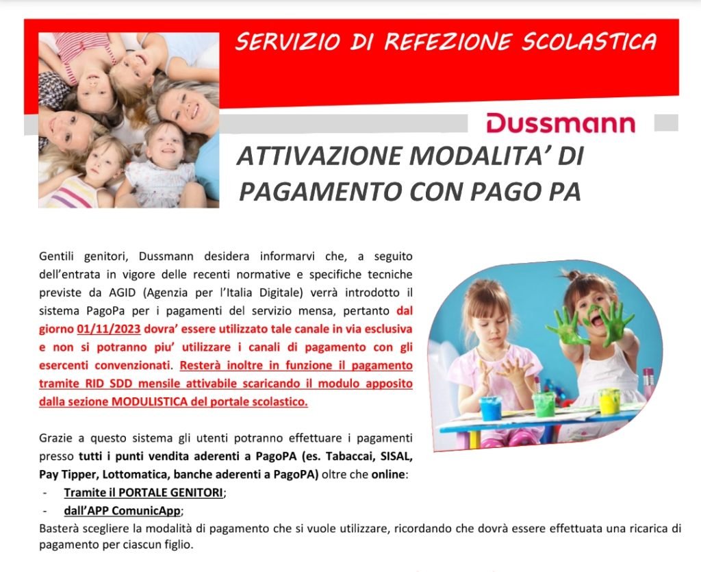 (MeridianaNotizie) Ariccia, 4 maggio 2023 – Dussmann ,la società che gestisce il servizio refezione nelle scuole di Ariccia desidera informare i genitori degli alunni che, a seguito dell’entrata in vigore delle recenti normative e specifiche tecniche previste da AGID (Agenzia per l’Italia Digitale) verrà introdotto il sistema PagoPa per i pagamenti del servizio mensa, pertanto dal giorno 01/11/2023 dovra’ essere utilizzato tale canale in via esclusiva e non si potranno piu’ utilizzare i canali di pagamento con gli esercenti convenzionati. Resterà inoltre in funzione il pagamento tramite RID SDD mensile attivabile scaricando il modulo apposito dalla sezione MODULISTICA del portale scolastico. Grazie a questo sistema gli utenti potranno effettuare i pagamenti presso tutti i punti vendita aderenti a PagoPA (es. Tabaccai, SISAL, Pay Tipper, Lottomatica, banche aderenti a PagoPA) oltre che online: – Tramite il PORTALE GENITORI; – dall’APP ComunicApp; Basterà scegliere la modalità di pagamento che si vuole utilizzare, ricordando che dovrà essere effettuata una ricarica di pagamento per ciascun figlio. L’informativa completa è disponibile sul sito istituzionale del Comune di Ariccia . Il testo da cercare nel sito è : Informativa attivazione pago PA del 3 maggio 2023.
