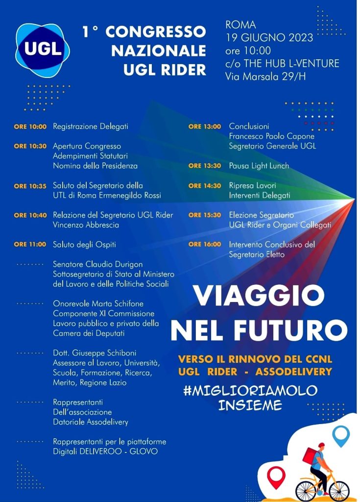 Domani, Lunedì 19 giugno, alle ore 10.00, presso THE HUB L-Venture in via Marsala, 29/H, a Roma, si terrà il 1° Congresso nazionale UGL Rider 2023, Viaggio nel futuro – Verso il rinnovo del CCNL.