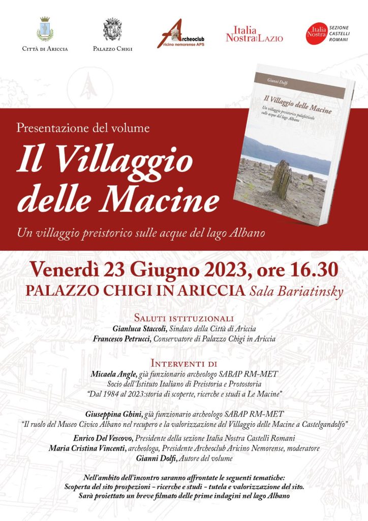 Lo scrittore Gianni Dolfi presenterà venerdì 23 giugno alle ore 16:30 presso la Sala Bariatinsky di Palazzo Chigi la sua ultima “fatica” dal titolo “IL VILLAGGIO DELLE MACINE”; un insediamento preistorico, addirittura del periodo del “rame”, rinvenuto per caso circa 40anni fa sulle sponde del lago di Castel Gandolfo.