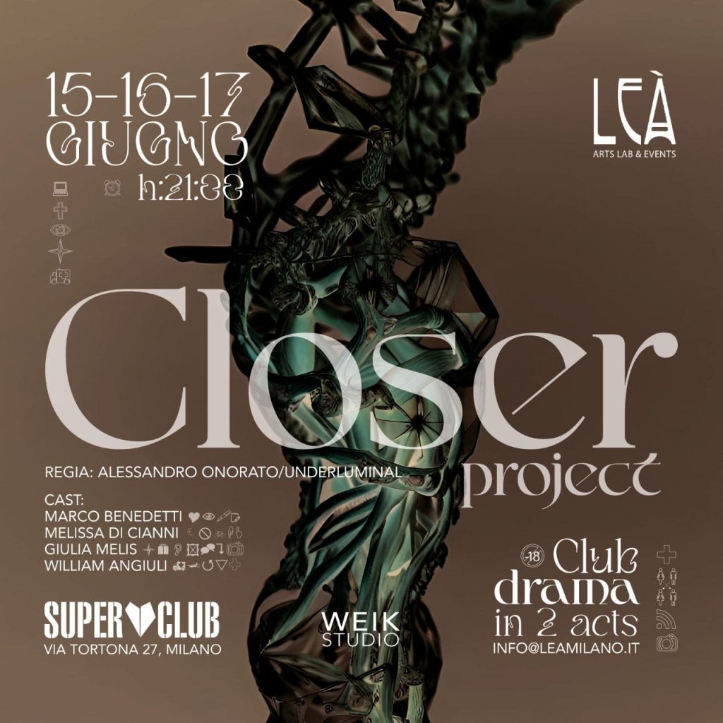 Giovedì 15, venerdì 16, sabato 17 giugno, alle ore 21.00 (con apertura porte alle 20.30), presso il Super Club di Milano, debutta “CLOSER project”, il club drama in 2 atti adattato e diretto da Alessandro Onorato. Un classico del teatro contemporaneo dalla penna di Patrick Marber rivoluzionato per il Super Club: l’intreccio sentimentale e sessuale dei quattro protagonisti rivive in una dimensione sublimata e surreale grazie al lavoro del noto artista contemporaneo Fabio Weik, in un complesso equilibrio tra teatro, arte e moda. Il teatro entra così nei club, riportando il pubblico, anche dei più giovani, ad apprezzare la più antica delle arti performative. Lo spettacolo è presentato da Leà artLab & events assieme a Super Club.