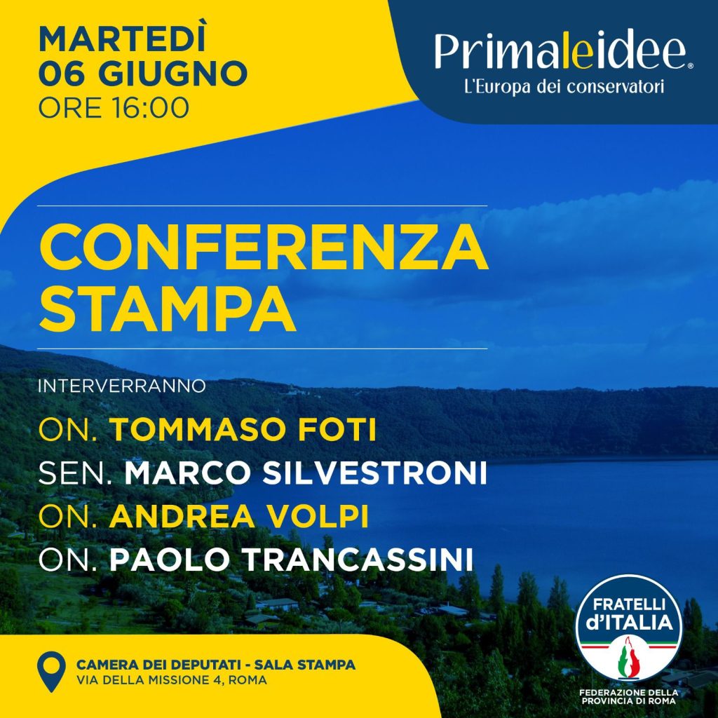 Torna “Prima le idee” la manifestazione politica giunta alla sua IX edizione promossa dalla Federazione di Fratelli d’Italia Provincia di Roma, che vedrà la partecipazione di diversi Ministri e Sottosegretari, alcuni Eurodeputati del gruppo ECR, assessori e consiglieri regionali del Lazio e numerosi amministratori locali e si terrà il 9/10/11 giugno allo Stabilimento La Pentima – Riva del Lago di Castel Gandolfo. Il tema scelto dagli organizzatori dell’evento è “l’Europa dei Conservatori” con l’obiettivo di confrontarsi sui temi di attualità in un’ottica generale di Governo Europeo, Nazionale e Regionale. Un’occasione per fare il punto sul lavoro del Governo e immaginare il futuro insieme a cittadini ed elettori. L’evento verrà presentato ufficialmente martedì 6 giugno prossimo alle ore 16:00 presso la sala stampa della Camera dei Deputati, alla presenza del Presidente del Gruppo di Fratelli d’Italia alla Camera On. Tommaso Foti, il Presidente della Federazione di FDI Provincia di Roma Sen. Marco Silvestroni, il Coordinatore Regionale di FDI Lazio On. Paolo Trancassini e il parlamentare del territorio On. Andrea Volpi.