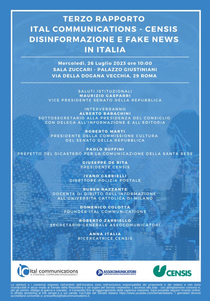Mercoledì 26 luglio, dalle ore 10.00, presso la Sala Zuccari di Palazzo Giustiniani del Senato della Repubblica in via della Dogana Vecchia, 29, a Roma, si terrà la presentazione del Terzo Rapporto Ital Communications-Censis “Disinformazione e fake news in Italia. Il sistema dell’informazione alla prova dell’Intelligenza Artificiale”. L’obiettivo della ricerca è di monitorare quanto accaduto all’interno del mondo della comunicazione, offrendo agli addetti ai lavori il punto di vista degli italiani sulle principali fenomenologie in atto e sui percorsi su cui occorre lavorare per generare comunicazione affidabile e di qualità.