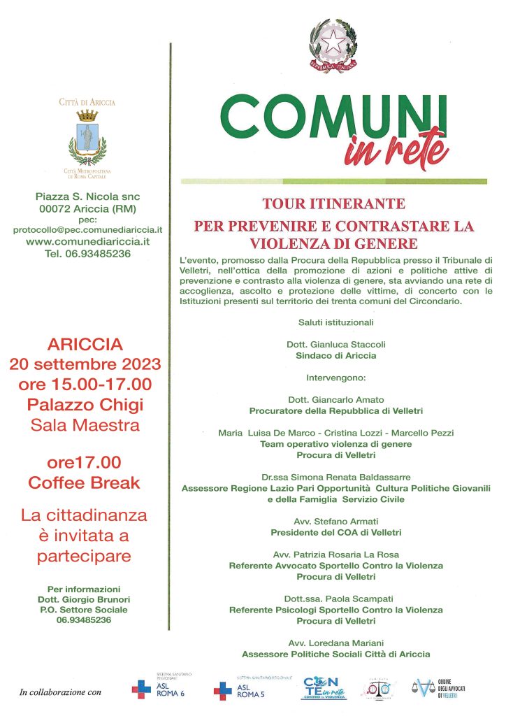 (MeridianaNotizie) Ariccia, 18 settembre 2023 – Mercoledì 20 settembre si svolgerà a Palazzo Chigi, dalle ore 15 alle 17, “Comuni in Rete”. L’evento è promosso dalla Procura della Repubblica presso il Tribunale di Velletri, nell’ottica della promozione di azioni e politiche attive di prevenzione e contrasto alla violenza di genere. La Procura è al lavoro per avviare una rete di accoglienza, ascolto e protezione delle vittime di concerto con le Istituzioni presenti sul territorio dei trenta comuni del Circondario. Di seguito il programma dell’iniziativa.
