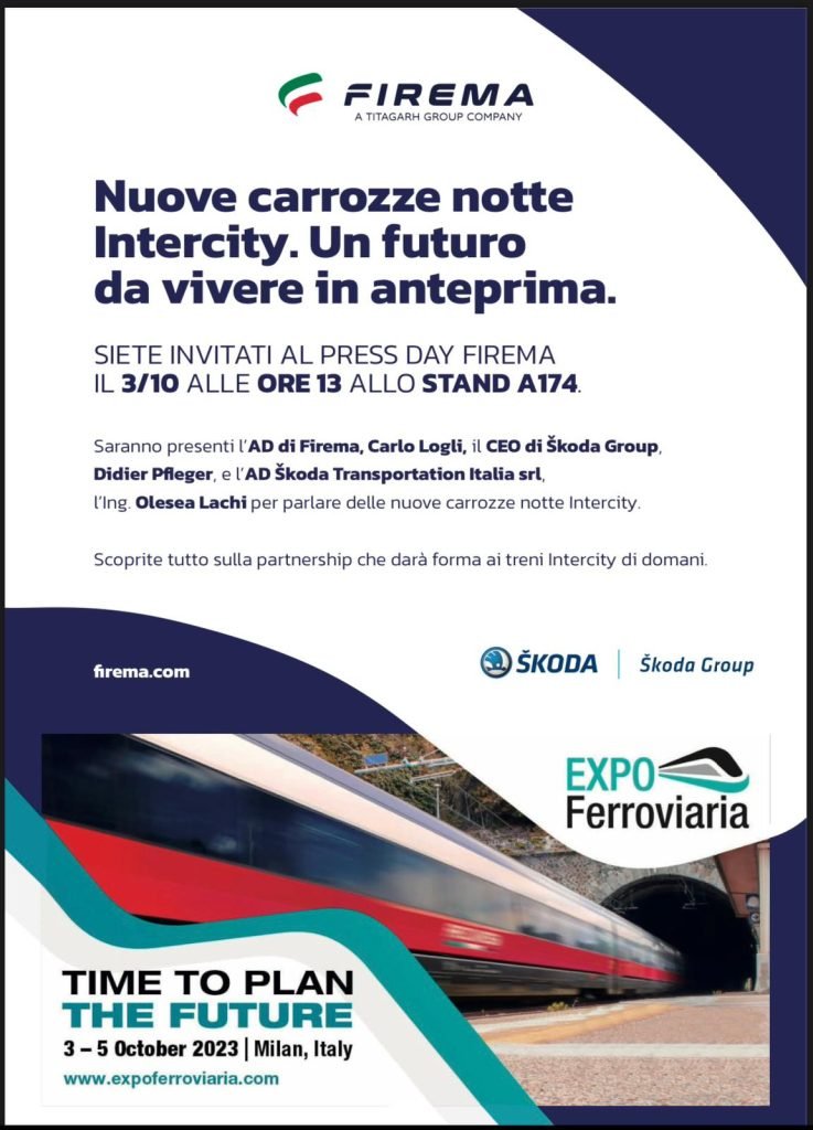 (Meridiana Notizie) Martedì 3 ottobre, alle ore 13, presso lo Stand A174 della Expo Ferroviaria 2023, in programma dal 3 al 5 ottobre alla Fiera Milano Rho, Firema S.p.a. e Skoda Transportation A.S. presenteranno in anteprima le nuove carrozze notte Intercity di Trenitalia. All’evento, organizzato nell’ambito della più importante esposizione internazionale italiana per la tecnologia ferroviaria, parteciperanno l’AD di Firema, Carlo Logli, il CEO di Škoda Group, Didier Pfleger, e l’AD SKODA TRANSPORTATION Italia srl, Olesea Lachi, per raccontare la partnership che darà forma ai treni intercity di domani.