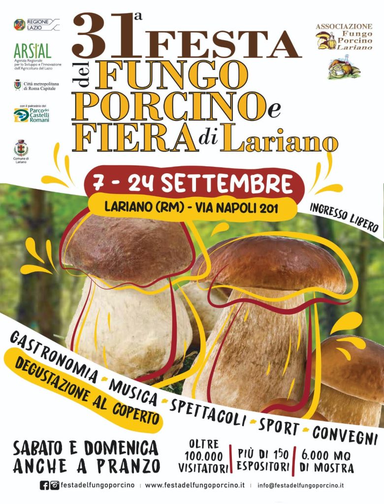 20mila mq di area espositiva, più di 150 espositori provenienti da ogni parte d’Italia, oltre 100mila visitatori nel 2022. Sono alcuni numeri della “Festa del Fungo Porcino” che si svolgerà dal 7 al 24 settembre presso via Napoli a Lariano, in provincia di Roma.