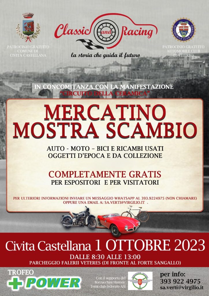 Il primo giorno di ottobre a Civita Castellana va in scena il “Circuito della ceramica”, manifestazione riservata ad auto d’epoca e di interesse collezionistico. Per la cronaca si tratta di un appuntamento che rinverdisce i fasti di quello che una volta era un tour di moto e che viene affiancato per questa prima edizione a quattro ruote da un mercatino.