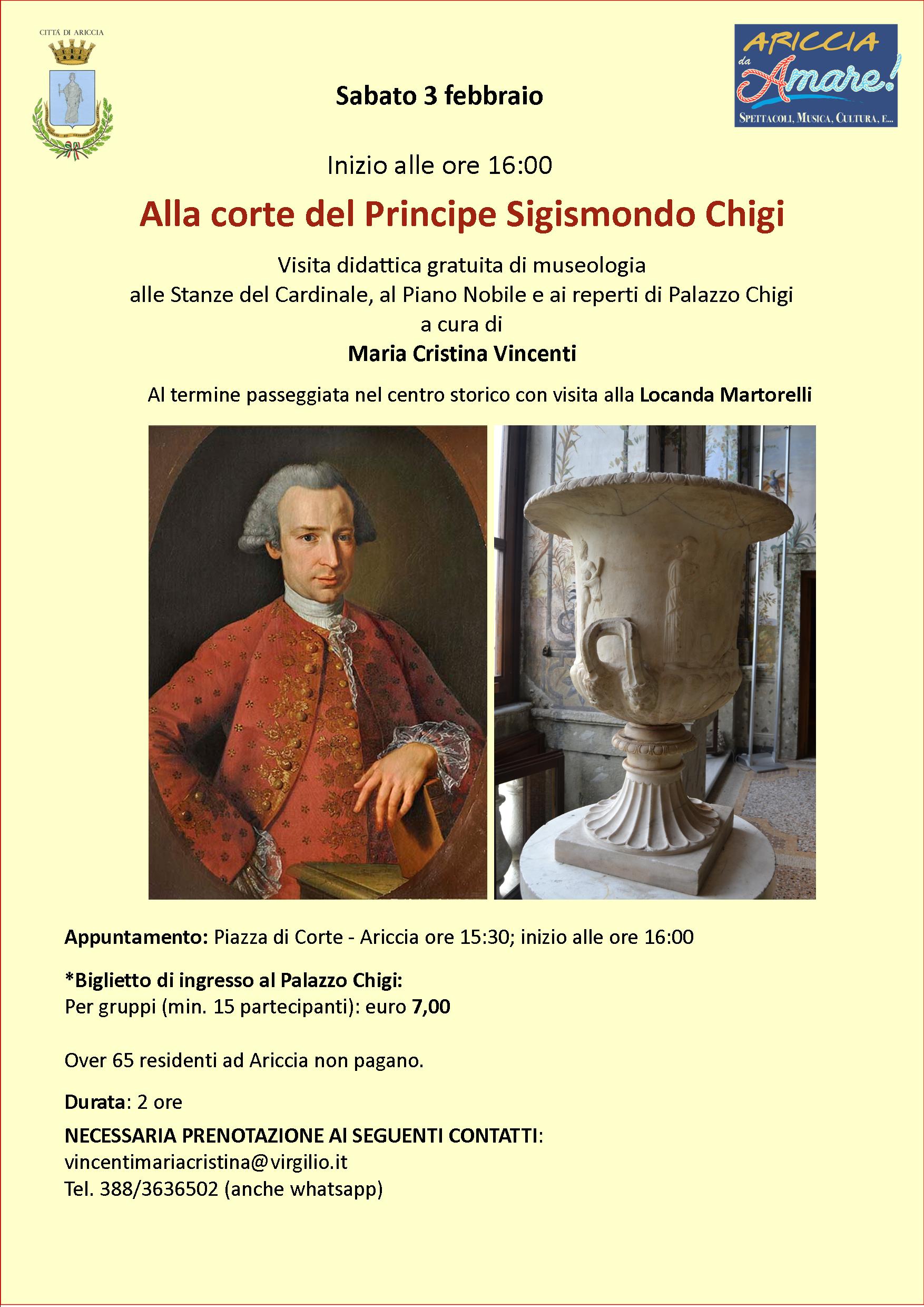 I visitatori conosceranno le Stanze del Cardinale, il Piano Nobile e i reperti conservati nella dimora barocca come il “Vaso Chigi” e la “Spada di Ariccia”. Il punto di forza di questi incontri invernali, a cura dell’archeologa/museologa Maria Cristina Vincenti (che è anche guida Aigae), è la professionalità e l’offerta diversificata con approfondimenti che riguardano i reperti in contesto museale, le preziose collezioni del Palazzo Chigi e le decorazioni pittoriche sia del Palazzo che della Locanda Martorelli, il trekking archeologico e la viabilità antica, per finire con i luoghi di culto. Sigismondo, figlio di Agostino Chigi Della Rovere di sua moglie, Maria Giulia Albani, era un appassionato di archeologia, promosse scavi archeologici con importanti rinvenimenti alcuni dei quali conservati nel Palazzo Chigi di Ariccia; amava la poesia e fu il committente di pregevoli cicli pittorici per il Palazzo Chigi di Roma e per quello di Ariccia. Il suo bibliotecario era Ennio Quirino Visconti. Membro dell’Arcadia ed illuminista frequentò Vittorio Alfieri, Metastasio e Vincenzo Monti.