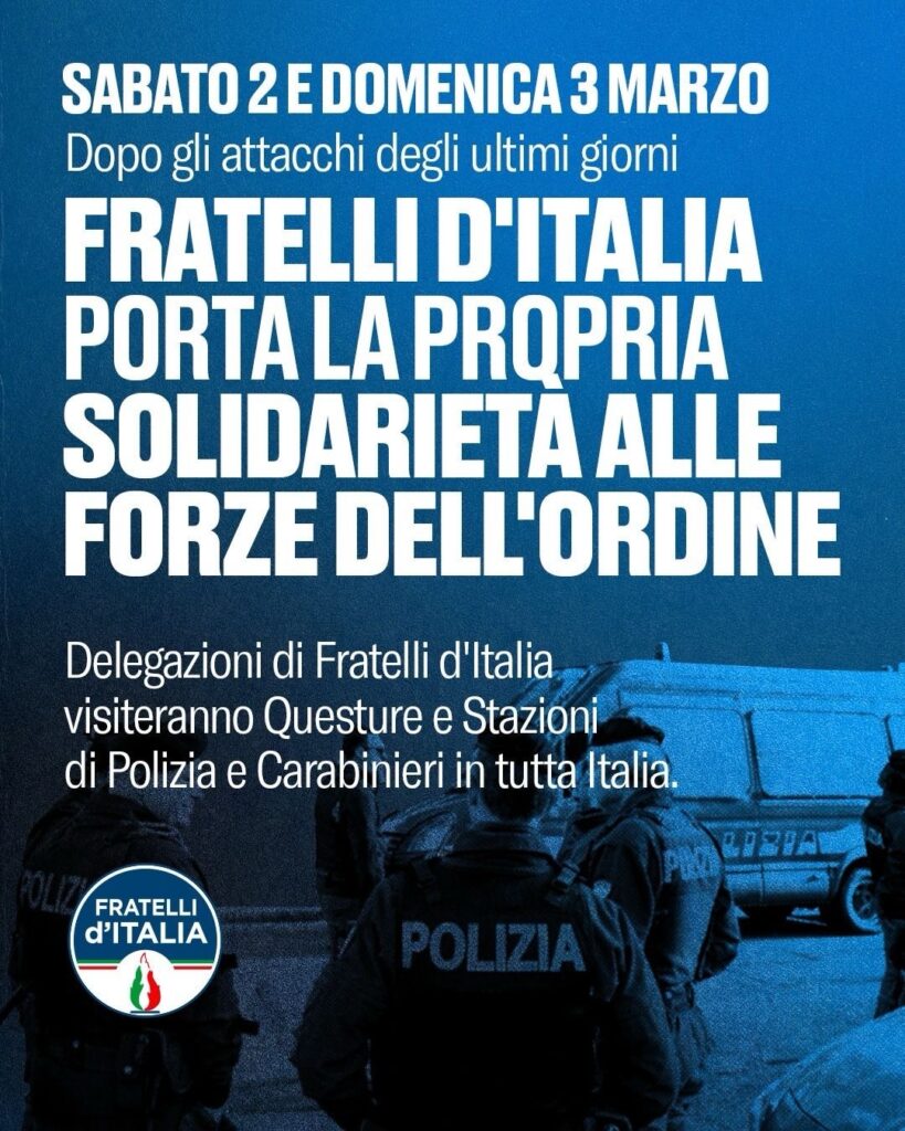 Domani, domenica 3 marzo, alle ore 11, una delegazione di Fratelli d’Italia provincia di Roma si recherà presso il Commissariato di Polizia di Genzano di Roma per solidarizzare con le forze dell’ordine, prese di mira in particolare nelle ultime settimane da inaccettabili aggressioni fisiche, ma anche mediatiche e politiche. All’incontro saranno presenti anche il Coordinatore Provinciale Sen. Marco Silvestroni, l’On. Andrea Volpi, Sindaco di Lanuvio, il Consigliere Comunale di Genzano Fabio Papalia , il Coordinatore Cittadino di FDI Alessandra Lattanzi, il coordinatore di Gioventù Nazionale Gabriele Pucci, Arnaldo Melaranci dell’assemblea nazionale di FDI e il Consigliere Regionale del Lazio Edy Palazzi. “Le forze dell’ordine sono il nostro presidio di sicurezza, per questo ci batteremo sempre per proteggerle”, spiegano in una nota gli organizzatori dell’iniziativa.