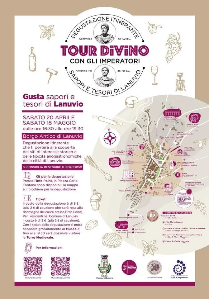 Continua il Tour DiVino con gli Imperatori promosso dall’amministrazione comunale di Lanuvio, in collaborazione con il Museo diffuso e le cantine vitivinicole locali. Il secondo dei tre appuntamenti previsti si terrà nel pomeriggio di sabato 20 aprile. In quell’occasione sarà possibile gustare sapori e tesori di Lanuvio con un biglietto integrato, che permetterà l’ingresso ai siti museali e la degustazione dei vini del territorio.