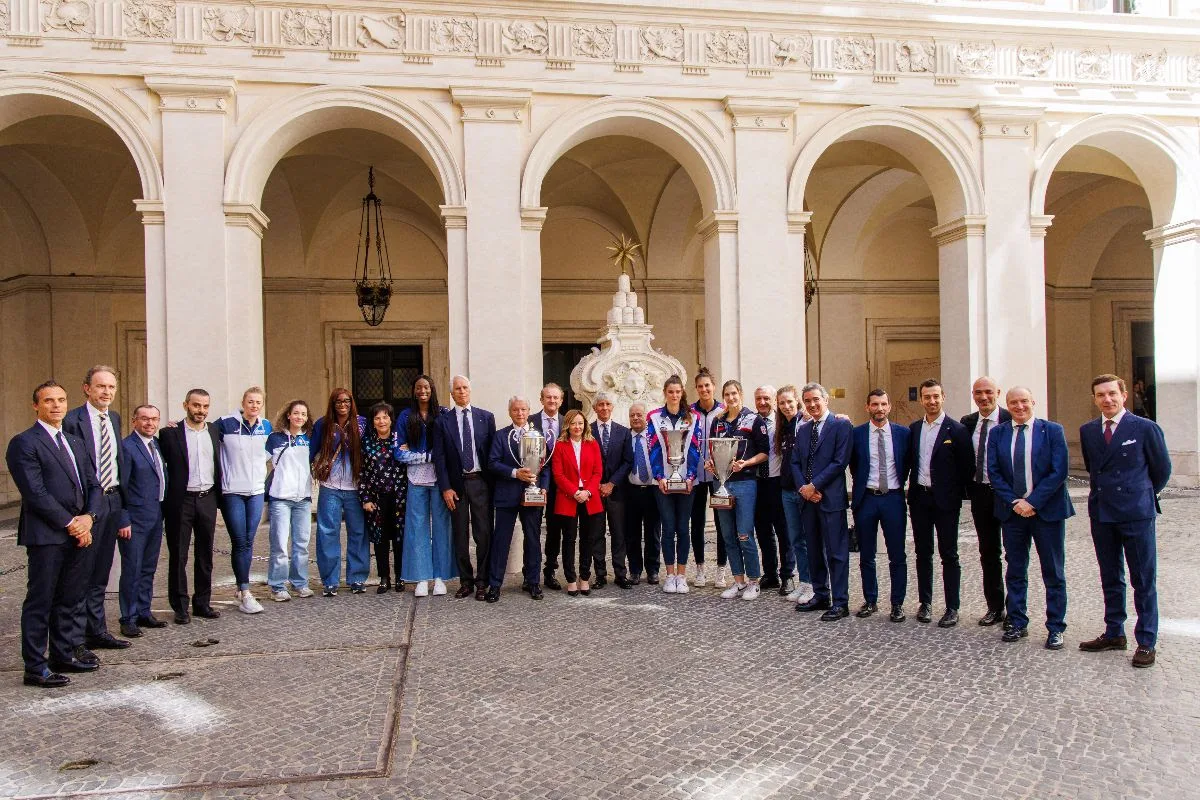 Oggi, giovedì 4 aprile dalle ore 11, una delegazione delle squadre vincitrici e finaliste delle Coppe europee, Igor Gorgonzola Novara, Reale Mutua Fenera Chieri ’76, Imoco Conegliano e Allianz Vero Volley Milano, è stata ricevuta a Palazzo Chigi dal Presidente del Consiglio Giorgia Meloni. Un’occasione per celebrare il settimo triplete della storia in Europa delle squadre della Serie A femminile, già detentrici della CEV Challenge Cup (Novara) e della CEV Volleyball Cup (Chieri) in attesa della Super Final di CEV Champions League tra Conegliano e Milano, in programma il 5 maggio ad Antalya, Turchia. Presenti anche il Ministro per lo Sport e i Giovani Andrea Abodi, il Presidente del Coni Giovanni Malagò, il Presidente della FIPAV Giuseppe Manfredi e il Presidente della Lega Pallavolo Serie A Femminile Mauro Fabris.