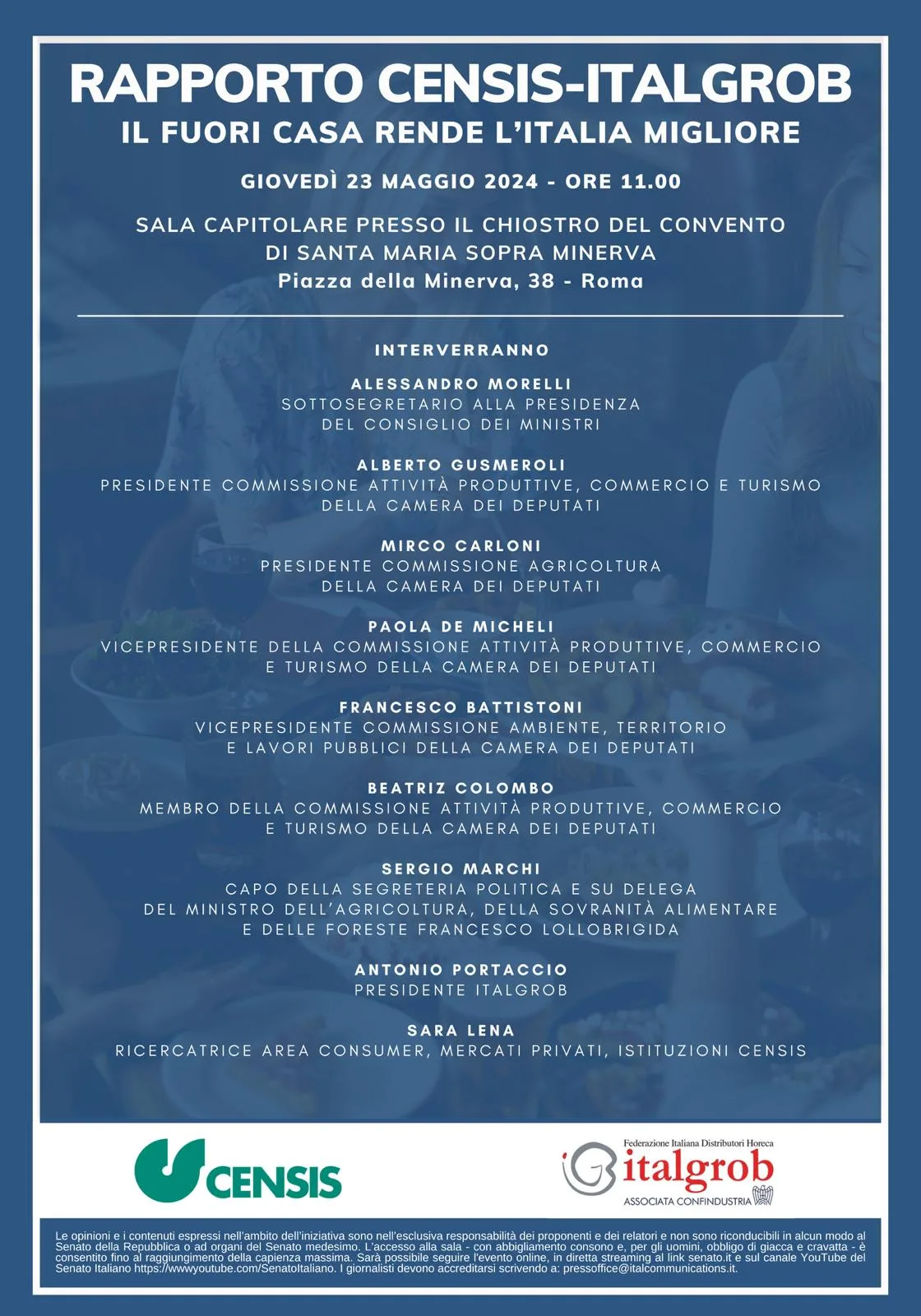 Giovedì 23 maggio 2024, dalle ore 11.00, presso la Sala Capitolare del Senato della Repubblica, si terrà la presentazione del Terzo Rapporto Italgrob-Censis “Il fuori casa rende l’Italia migliore”.
