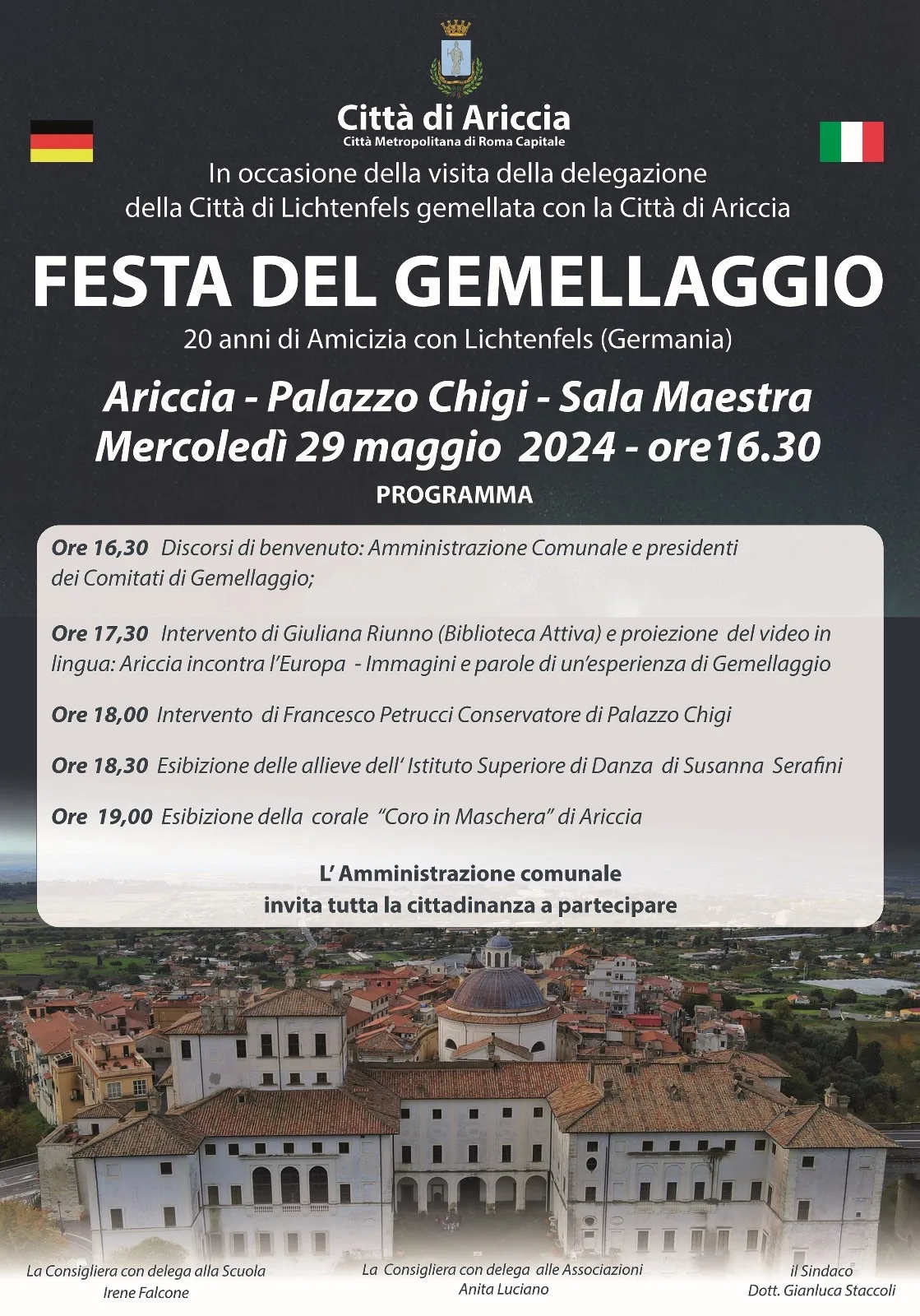 Per commemorare questo importante traguardo, dal 26 al 30 maggio 2024, Ariccia ospiterà una delegazione tedesca di Lichtenfels, in segno di reciprocità per l’ospitalità ricevuta a luglio 2023. Durante il soggiorno della delegazione, l’Amministrazione comunale ha organizzato la “Festa del Gemellaggio”, che si terrà mercoledì 29 maggio alle ore 16.30 presso la Sala Maestra di Palazzo Chigi. Questo evento vedrà la partecipazione degli ospiti tedeschi, delle famiglie che li ospitano e della cittadinanza.