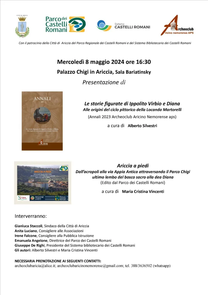 Mercoledì 8 maggio 2024, presso la prestigiosa sede di Palazzo Chigi, Sala Bariatinksy, a partire dalle ore 16:30, si svolgerà la presentazione di due interessanti contributi. L’evento è stato patrocinato dalla Città di Ariccia, dal Parco Regionale dei Castelli Romani e dalSistema Bibliotecario dei Castelli Romani.