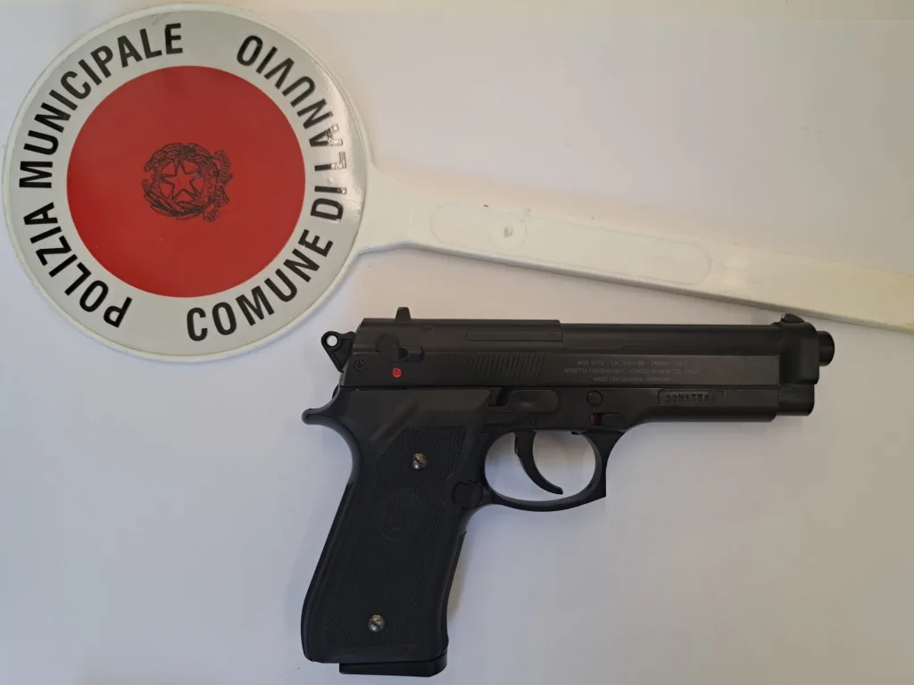 A seguito di quest’ultimo episodio, la donna che aveva già sporto denuncia per atti vandalici, si è recata nuovamente al comando della Polizia Locale per raccontare l’accaduto. A quel punto i caschi bianchi lanuvini hanno rintracciato il 55enne che ha consegnato spontaneamente la pistola utilizzata per minacciare la donna e la sua famiglia: una perfetta riproduzione di una Beretta 92F di calibro 6 che ha tratto in inganno tutti perchè privata del contrassegno rosso sulla bocca dell’arma.