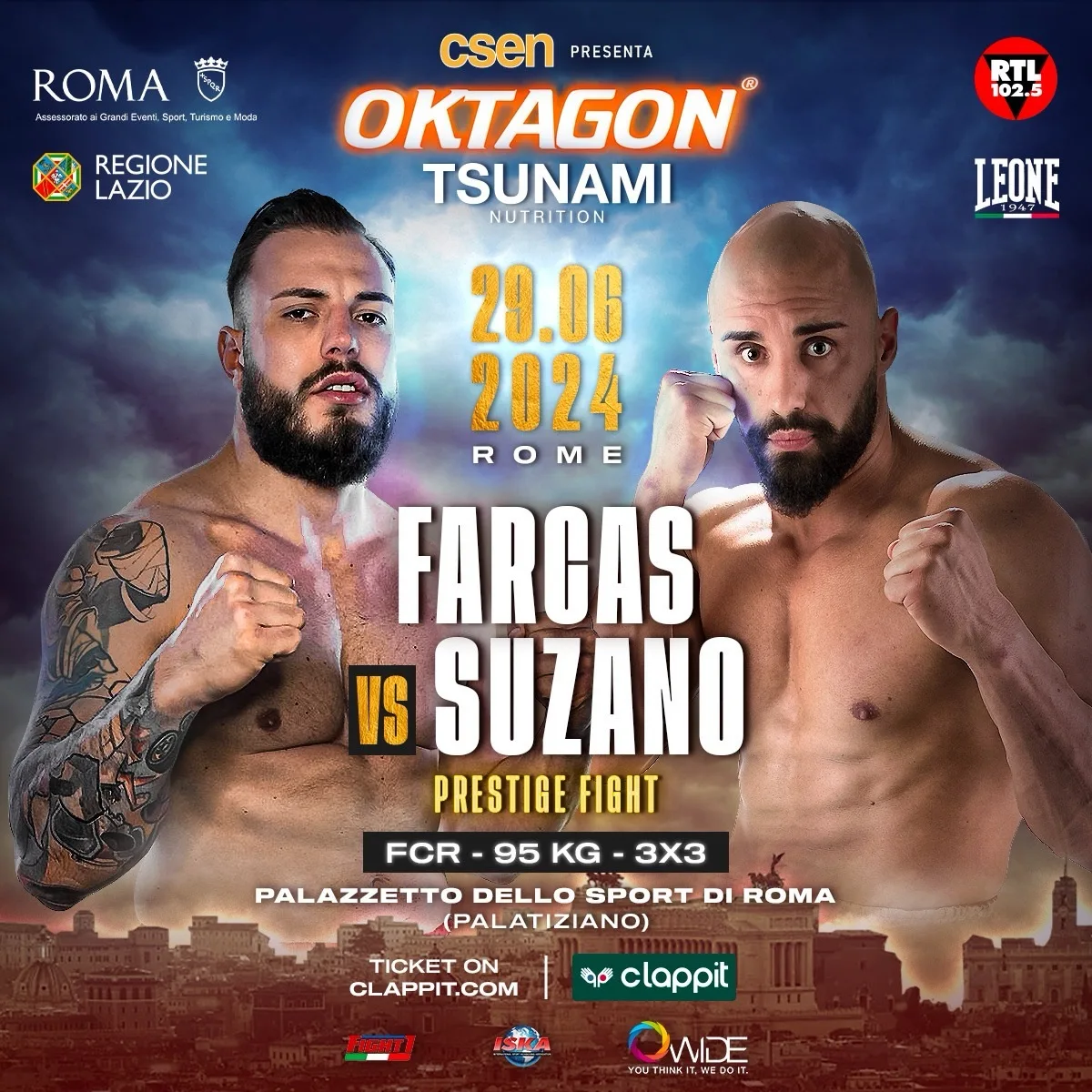 “Oktagon Tsunami” torna nella Capitale e lo fa in occasione della sua storica 27a edizione, sotto l’egida dello CSEN (ente di promozione sportiva) e in collaborazione con la Fight1 di Carlo Di Blasi, sabato 29 giugno al Palazzetto dello Sport di Roma (totalmente ristrutturato dopo gli interventi dell’assessorato allo Sport di Roma Capitale). In totale 34 atleti (di cui 20 italiani), 17 sfide, 11 Paesi rappresentati, 3 titoli mondiali ISKA e 4 Super Prestige Fight.