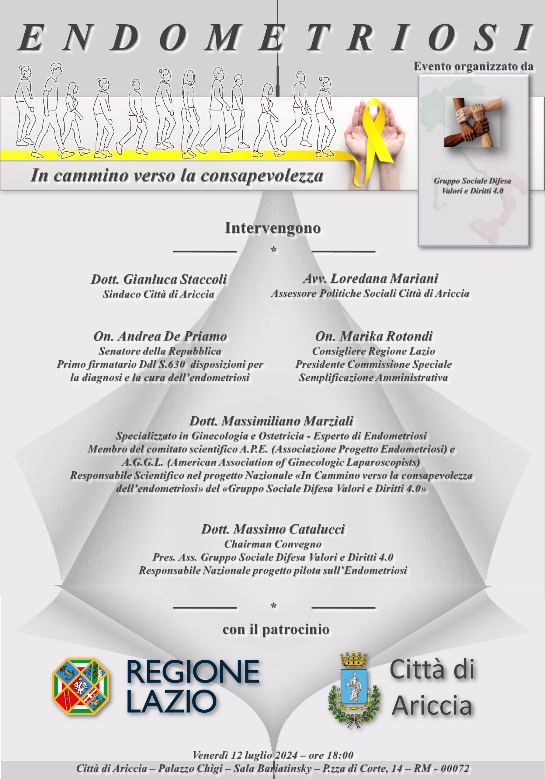“Al Convegno di Ariccia, oltre al Consigliere Marika Rotondi, sempre presente nei nostri Convegni da quando abbiamo dato vita a questo tour ‘In-Formativo’ da marzo 2023, ci sarà un’altra presenza molto importante, quella del Senatore della Repubblica, On. Andrea De Priamo che sta seguendo in Senato l’evolversi del Ddl S.630 – disposizioni per la diagnosi e la cura dell’endometriosi – di cui è il primo firmatario.””“Ora, mi aspetto che la Città di Ariccia – ha concluso il Dott. Catalucci – risponda con interesse e grande partecipazione al convegno che terremo il prossimo 12 luglio, nella favolosa cornice di Palazzo Chigi, evento questo, che avrà luogo grazie anche al grande lavoro svolto da Sandro Vennarucci che ha collaborato a stretto contatto con la nostra Coordinatrice regionale del Lazio, Moira Masi e le istituzioni locali che si sono dimostrate molto accoglienti e partecipative nelle fasi organizzative.”