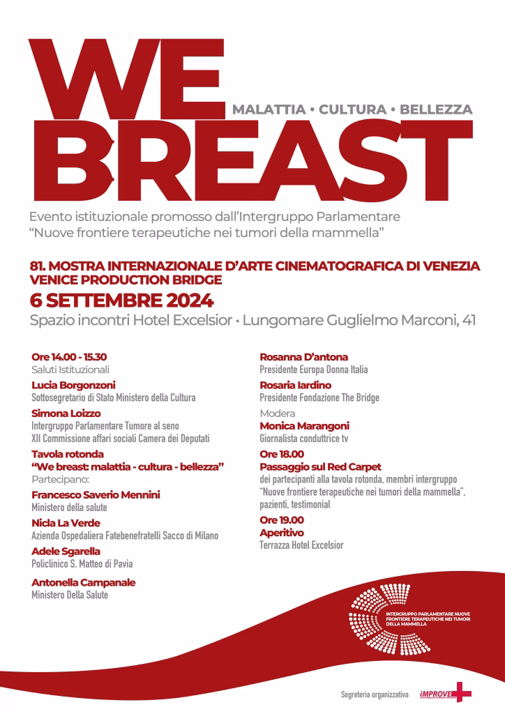 Venerdì 6 settembre 2024, a Venezia, nell’ambito della 81ª Mostra Internazionale del Cinema, con inizio alle ore 14, si terrà l’evento “We breast: malattia – cultura – bellezza”, promosso dall’Intergruppo parlamentare “Nuove frontiere terapeutiche nei tumori della mammella”, in collaborazione con il Ministero della Cultura e Fondazione The Bridge.