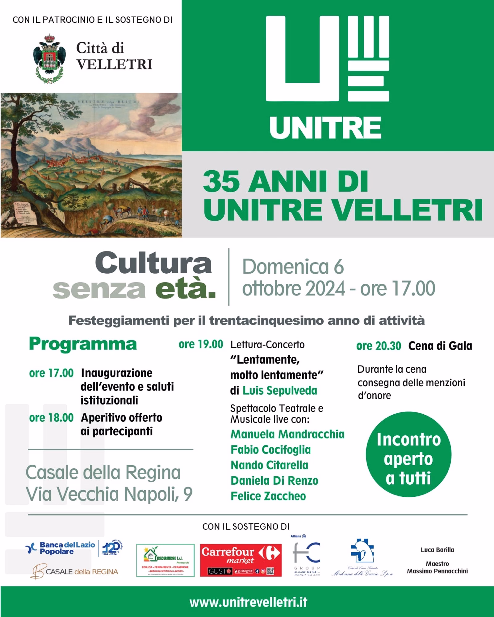 L’Unitre di Velletri si appresta a festeggiare i suoi primi trentacinque anni e la manifestazione in grande stile è stata resa possibile grazie al sostegno degli sponsor – Banca Popolare del Lazio, Luca Barilla, Allianz Agenzia FC Group 001, Clinica Madonna delle Grazie, Carrefour, Maestro Massimo Pennacchini Edilceramiche – e realizzata con il patrocinio e il contributo del Comune di Velletri.