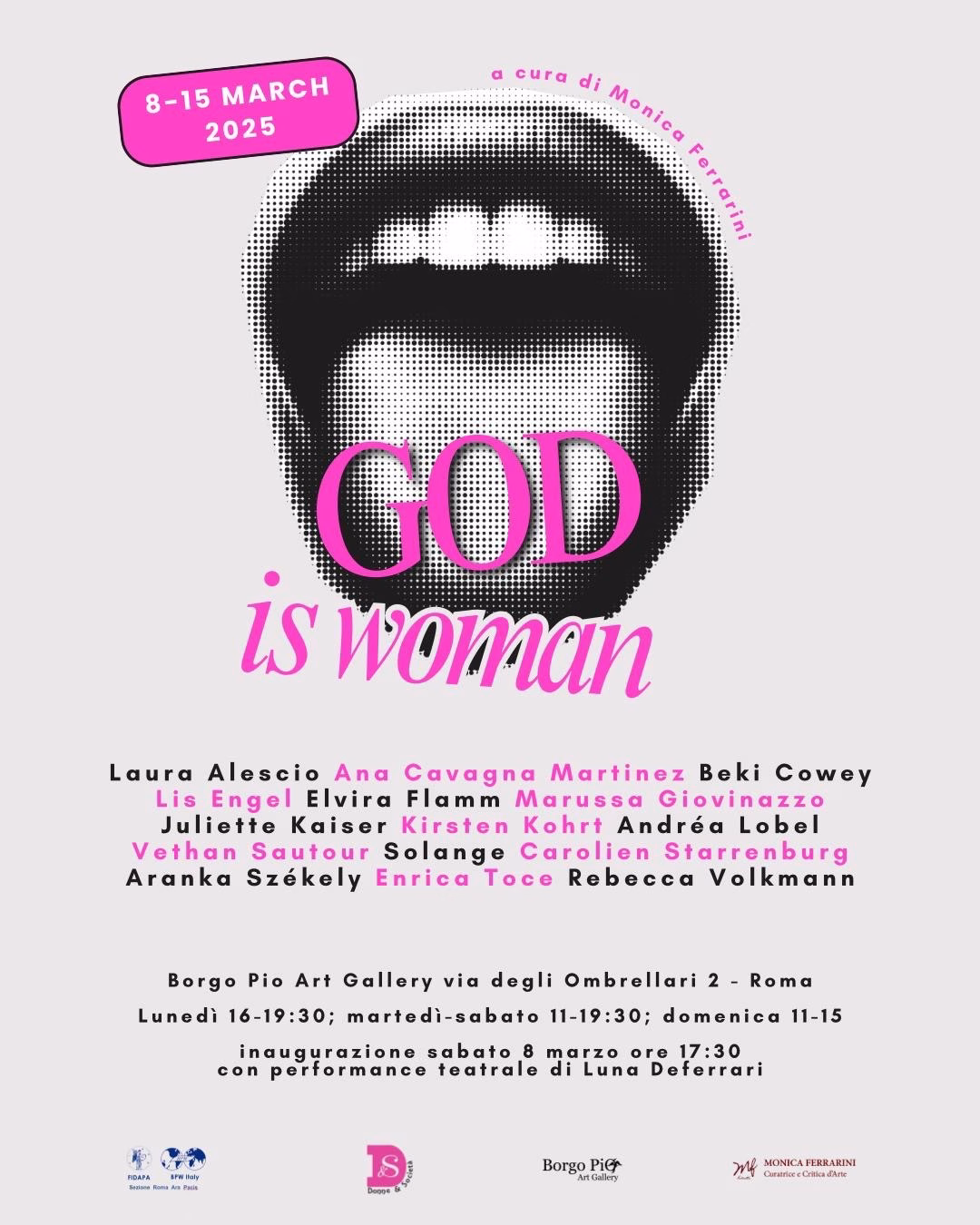 Verrà inaugurata sabato 8 marzo alle ore 17:30 la mostra collettiva di arte contemporanea “God is Woman” presso Borgo Pio Art Gallery in via degli Ombrellari 2 a Roma. L’evento è curato dal critico d’arte Monica Ferrarini. Il giorno dell’inaugurazione ci sarà una performance teatrale dell’attrice Luna Deferrari che reciterà il monologo “La Dea” tratto dalla raccolta “In her shoes” di Gloria Calderón Kellett.