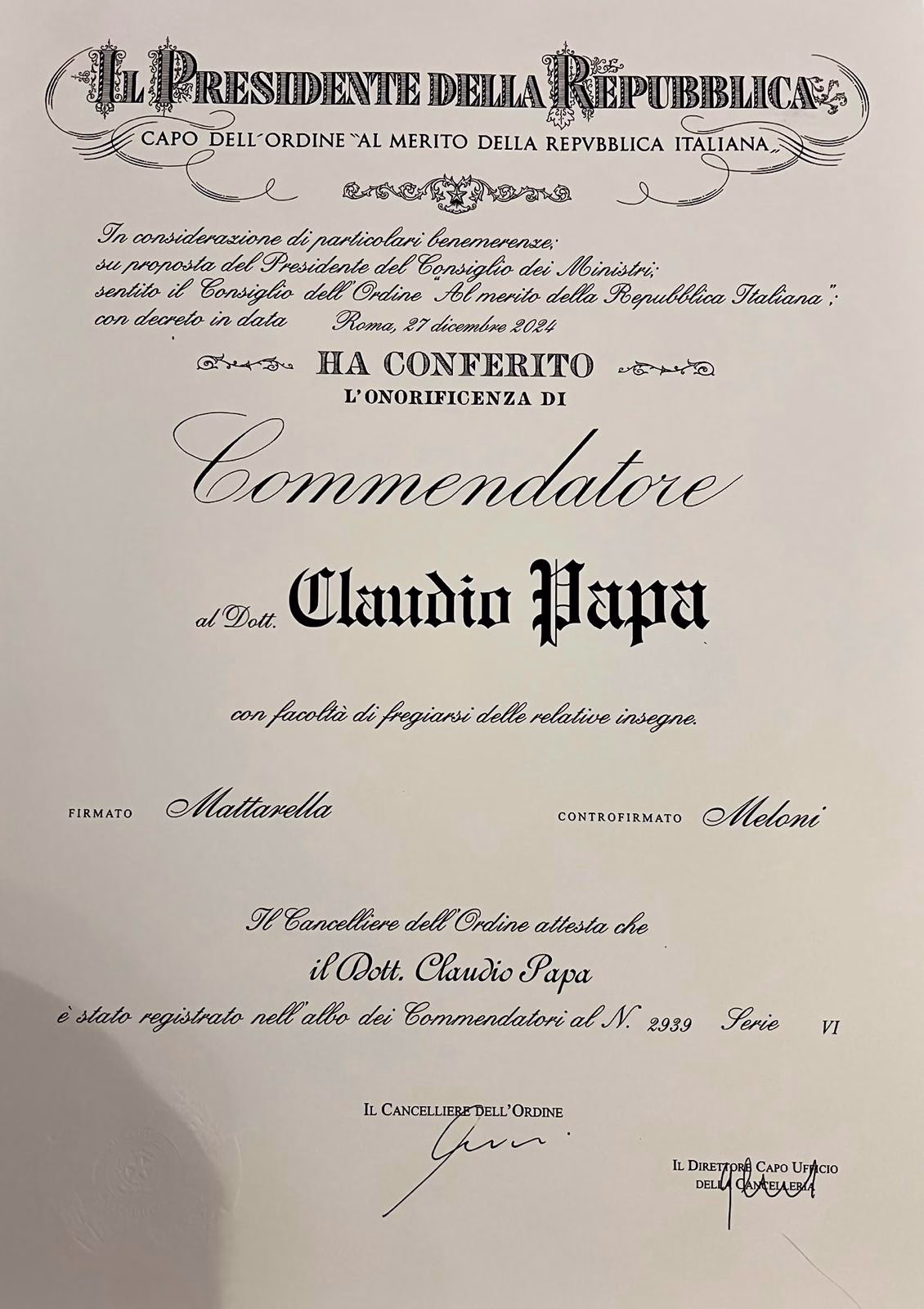 Già cavaliere al merito della Repubblica Italiana, l’amministratore Nutfruit Italia e presidente Coldiretti Molise, Claudio Papa, distinguendosi per le iniziative socio culturali svolte in Italia e all’estero, presso l’Aula Magna dell’ex seminario vescovile della Diocesi di Isernia–Venafro riceve il 2 giugno 2025 il diploma di “Commendatore al merito della Repubblica Italiana”. Qualche giorno fa lo stesso Papa aveva ricevuto a Philadelphia dalla Filitalia International & Foundation il prestigioso riconoscimento “Heroes Awards 2024” negli Stati Uniti, destinato a uomini e donne che hanno contribuito positivamente all’Italian Heritage e al servizio pubblico nel mondo.