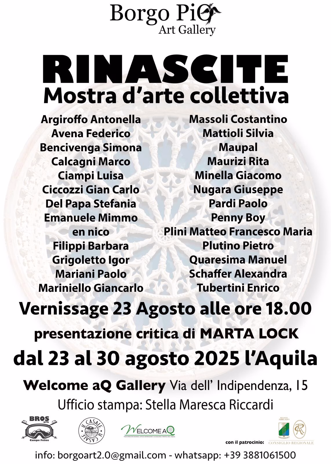 Si inaugurerà il prossimo 23 agosto alle 18 per chiudersi il giorno 30 dello stesso mese, “Rinascite” esposizione collettiva di arte contemporanea che la Borgo Pio Art Gallery di Roma presenterà a L’Aquila in occasione della Festa della Perdonanza, patrimonio UNESCO, in collaborazione e presso la Welcome Aq Gallery, un nuovo spazio situato in via dell’Indipendenza 15 a due passi dal Duomo.