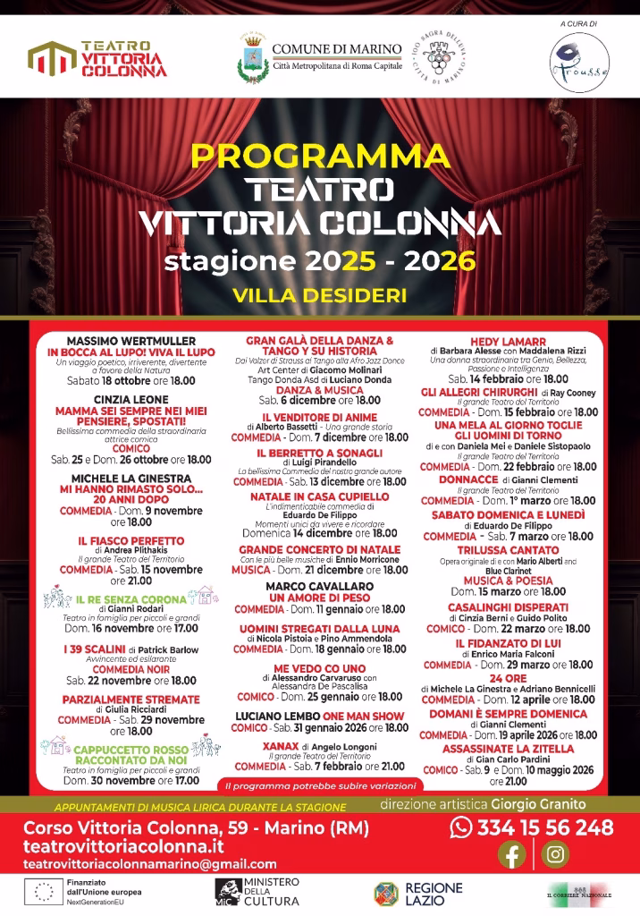 Prenderà il via il 18 ottobre 2025 al Teatro Vittoria Colonna di Marino la nuova stagione 2025/2026 che terminerà il 10 maggio 2026 tra commedie di travolgente comicità al grande classico del Teatro d’autore. Non mancheranno anche pregevoli appuntamenti di musica e di danza.