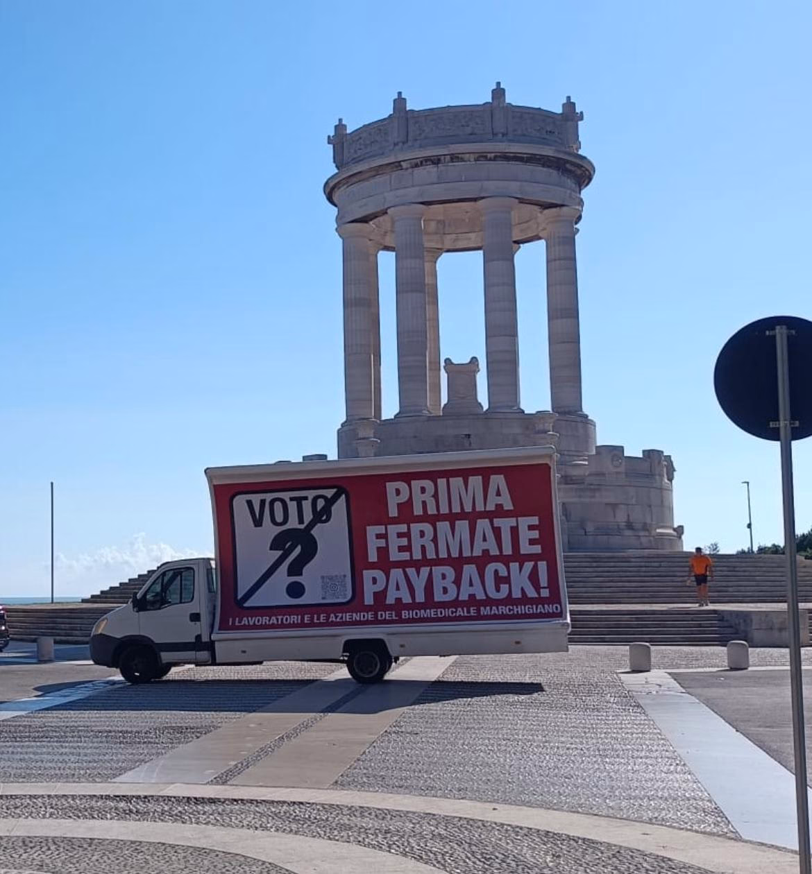 “Voto? Prima cancellate il payback!”. È lo slogan che campeggia sulle vele pubblicitarie che da questa mattina percorrono le strade di Ancona, accanto ai messaggi elettorali dei vari candidati. Ma questa volta non si tratta di promesse di campagna, bensì di una richiesta urgente e concreta: fermare il meccanismo del payback sanitario, che rischia di travolgere centinaia di lavoratori e imprese del comparto biomedicale marchigiano.