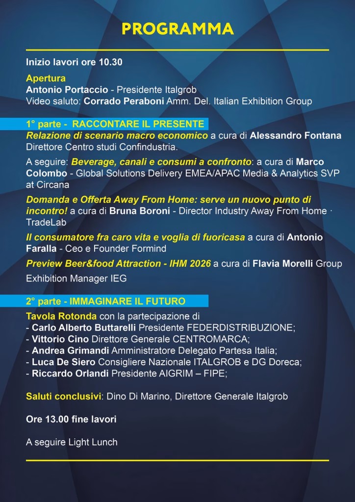 Interverranno all’evento: Antonio Portaccio, Presidente Italgrob; Corrado Peraboni, Amministratore Delegato Italian Exhibition Group (IEG); Alessandro Fontana, Direttore Centro Studi Confindustria; Marco Colombo, Global Solution Delivery EMEA/APAC Media & Analitics SVP Circana; Bruna Boroni, Director Industry Away From Home TradeLab; Antonio Faralla, Ceo e Founder Formind; Flavia Morelli, Group Exhibition Manager IEG; Carlo Alberto Buttarelli, Presidente di Federdistribuzione; Vittorio Cino, Direttore Generale di Centromarca; Andrea Grimandi, Amministratore Delegato Partesa Italia; Luca De Siero, Consigliere Nazionale Italgrob e Direttore Generale Doreca; Riccardo Orlandi, Presidente AIGRIM–FIPE; Dino Di Marino, Direttore Generale Italgrob.