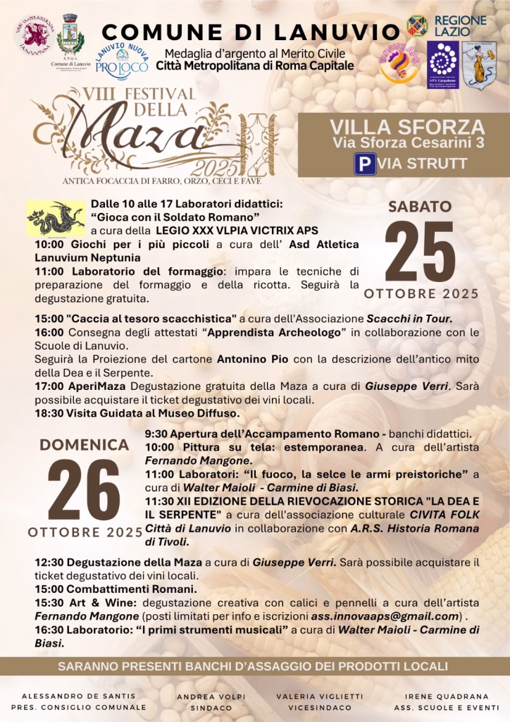 “La Maza è simbolo di memoria e identità – dichiara il Vicesindaco Valeria Viglietti – con questo festival vogliamo valorizzare le nostre radici attraverso esperienze coinvolgenti che uniscono cultura, gusto e partecipazione. È un’occasione per riscoprire Lanuvio in chiave autentica e conviviale.”