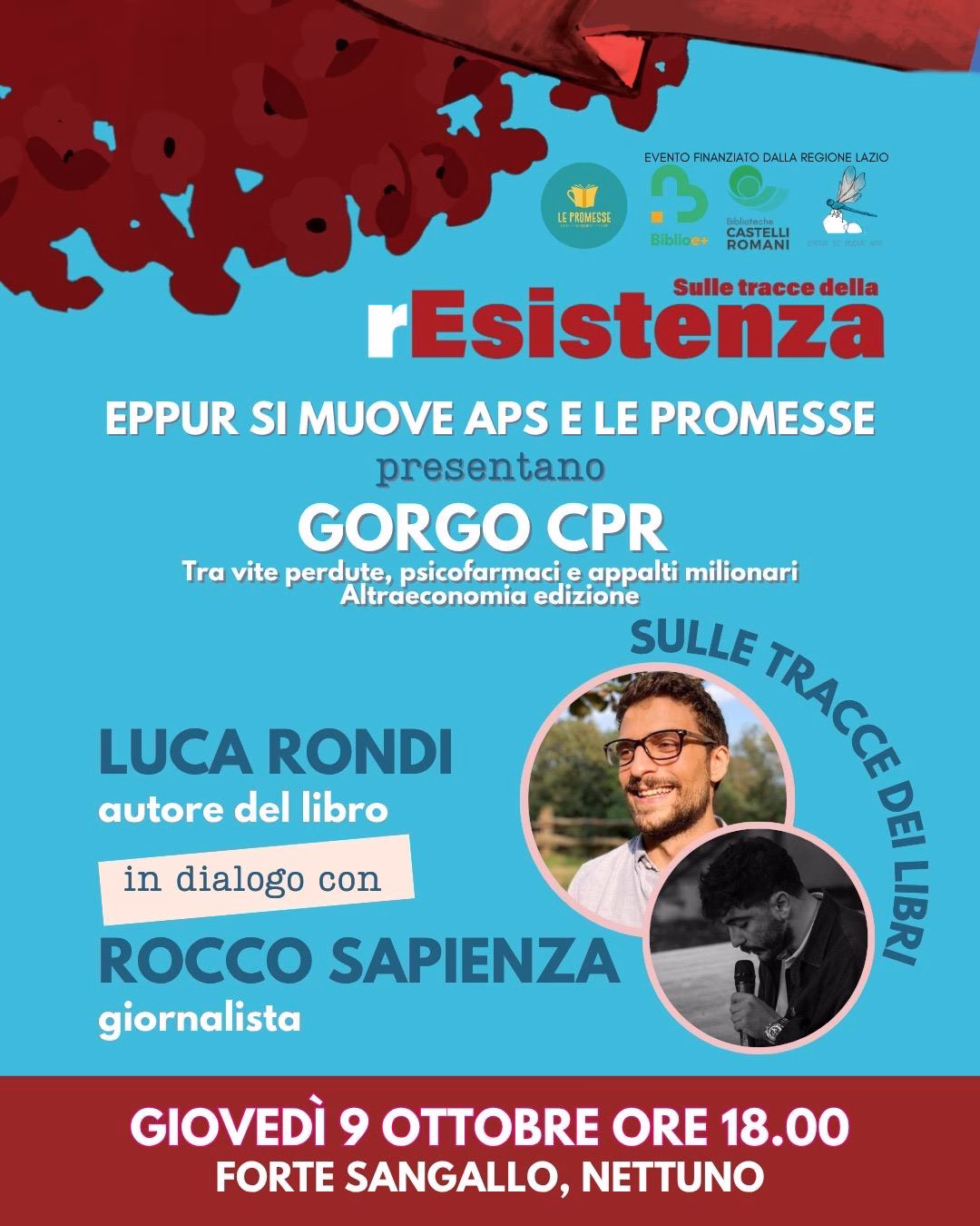 Giovedì 9 ottobre alle ore 18 in collaborazione con la libreria “Le Promesse” di Albano, “Sulle tracce dei libri”, con la presentazione del testo “Gorgo CPR. Tra vite perdute, psicofarmaci e appalti milionari” (edizioni AltraEconomia), alla presenza dell’autore Luca Rondi in dialogo con Rocco Sapienza, giornalista.