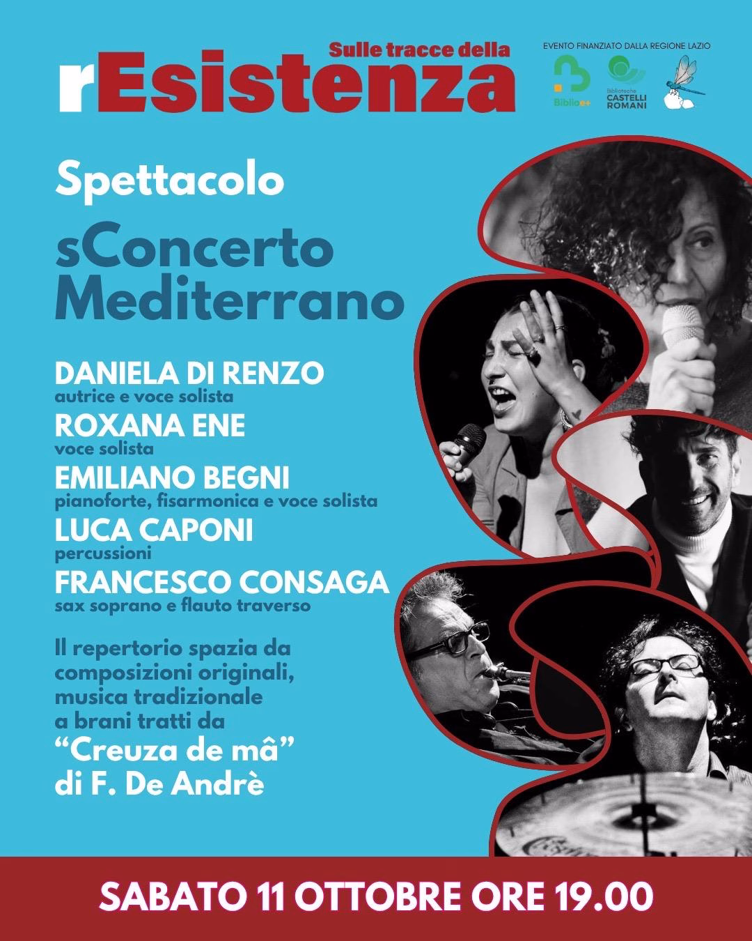 Segue, alle 19, lo spettacolo di teatro-canzone “sConcerto Mediterraneo”, viaggio tra le orme dei viaggiatori del mare spaziando da composizioni originali, musica tradizionale e brani tratti da “Creuza de mà” di Fabrizio De Andrè, con Daniela Di Renzo, autrice e voce solista, Roxana Ene, voce solista, Emiliano Begni (pianoforte, fisarmonica e voce), Luca Caponi (percussioni) e Francesco Consaga (sax soprano e flauto traverso).