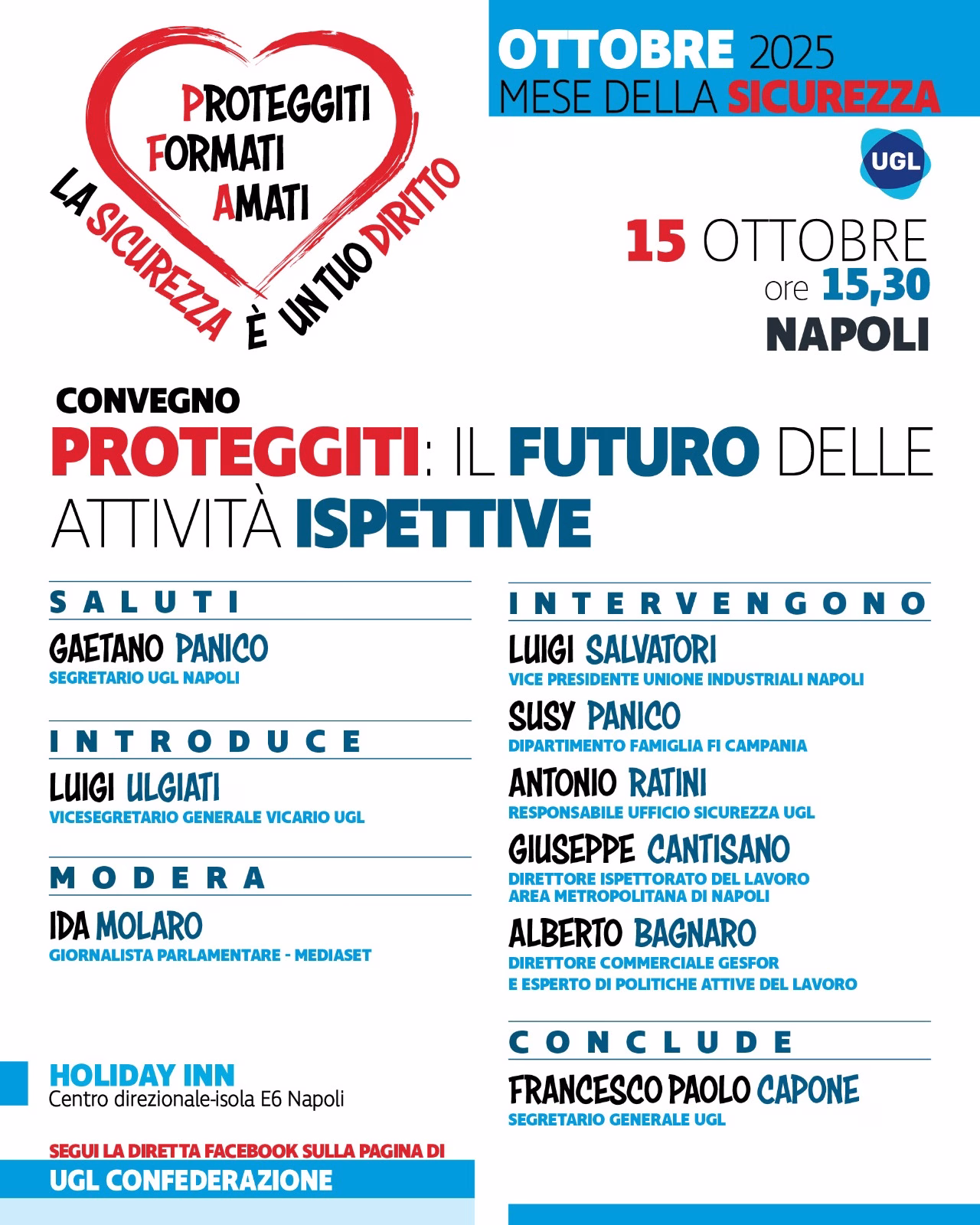 Mercoledì 15 Ottobre, presso Holiday Inn, Centro direzionale-isola E6, a Napoli, alle ore 15.30, si terrà il convegno “Proteggiti: il futuro delle attività ispettive” promossa dal Sindacato UGL, un incontro dedicato a rafforzare e diffondere la cultura della sicurezza nei luoghi di lavoro, con il contributo di rappresentanti istituzionali e sindacali, nel contesto della campagna UGL “Ottobre, mese della sicurezza nei luoghi di lavoro”, che prevede la realizzazione di numerose iniziative su tutto il territorio nazionale volte a richiamare l’attenzione di istituzioni e cittadini sul valore della sicurezza e della prevenzione nei luoghi di lavoro.