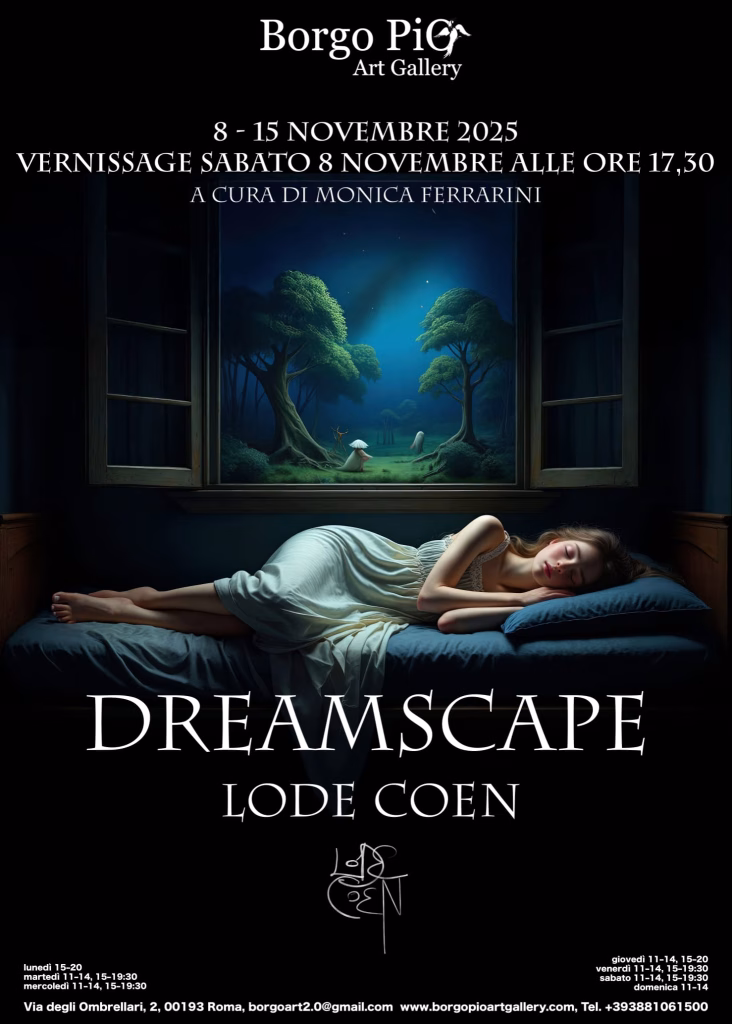 Verrà inaugurata sabato 8 novembre alle ore 17:30 la mostra personale di pittura dell’artista Lode Coen “Dreamscape” presso Borgo Pio Art Gallery in via degli Ombrellari 2 a Roma. L’evento è curato dal critico d’arte Monica Ferrarini.