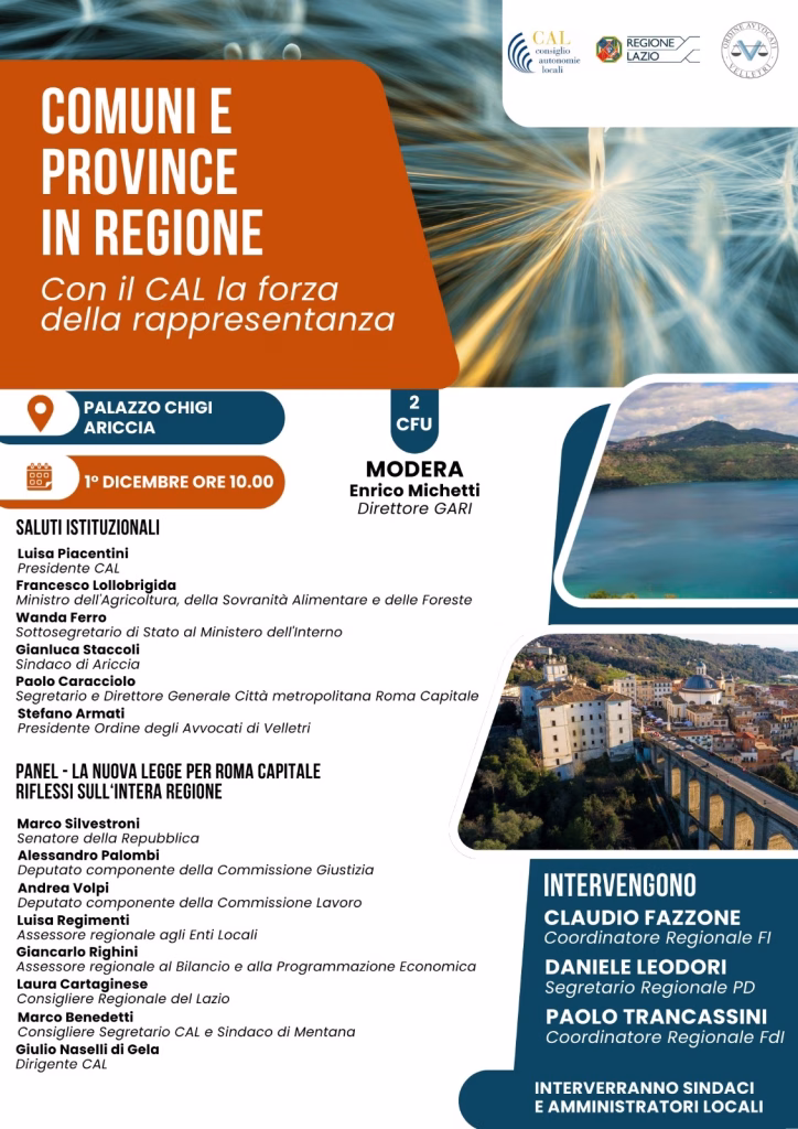 A moderare l’incontro sarà Enrico Michetti, Direttore della Fondazione G.A.R.I., mentre i saluti istituzionali saranno affidati alla Presidente del CAL Luisa Piacentini, al Ministro dell’Agricoltura Francesco Lollobrigida, al Sottosegretario all’Interno Wanda Ferro, al Sindaco di Ariccia Gianluca Staccoli, al Segretario Generale della Città Metropolitana di Roma Capitale Paolo Caracciolo e al Presidente dell’Ordine degli Avvocati di Velletri Stefano Armati.