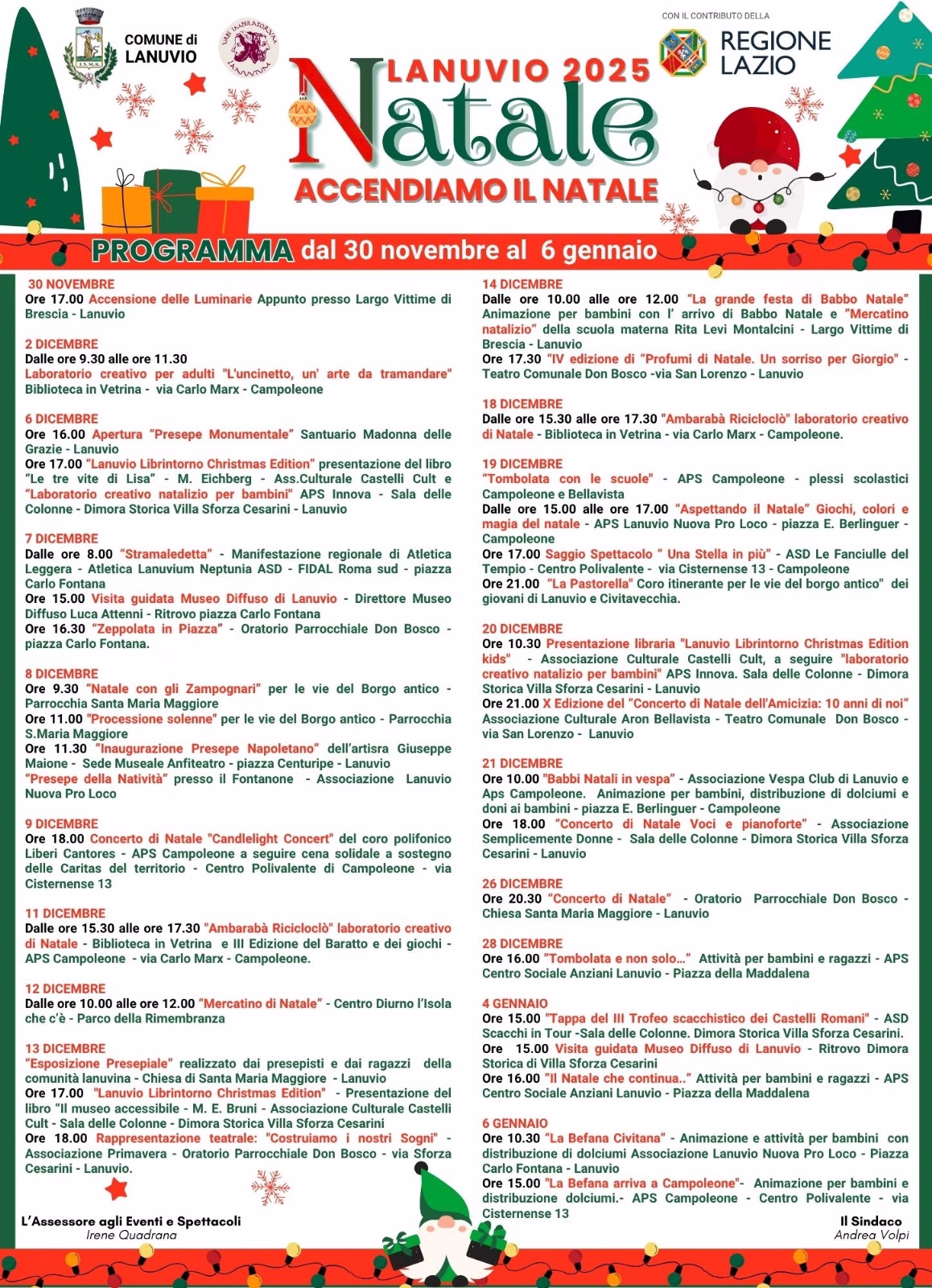 «Ringrazio tutte le associazioni che hanno reso possibile questa edizione – aggiunge Quadrana – insieme all’amministrazione comunale, al Sindaco Andrea Volpi, al Consigliere delegato alla Cultura Alessandro De Santis e all’Assessore allo Sport Valeria Viglietti, per la collaborazione concreta. Non ci resta che attendere l’accensione delle luminarie del 30 novembre per dare ufficialmente il via al Natale Lanuvino 2025!».