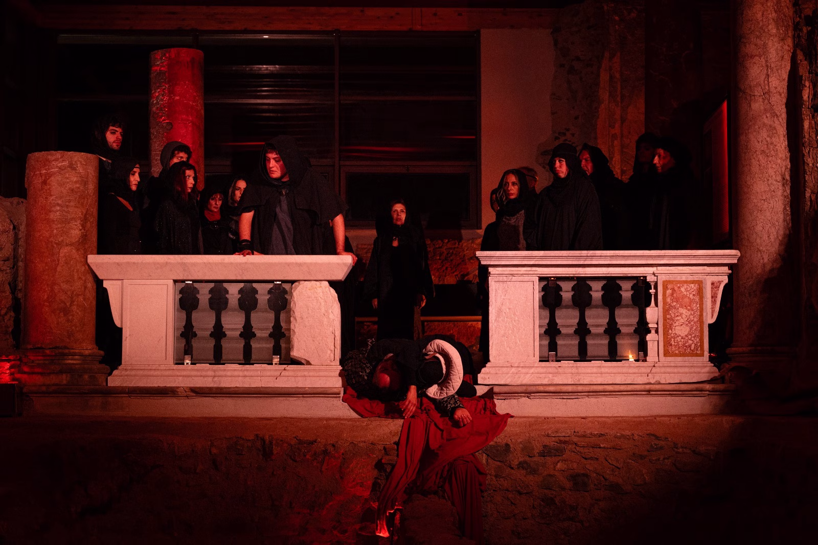 La recitazione, immersa nel silenzio eloquente e solenne dell’area archeologica e di un pubblico rapito, ha assunto così un valore amplificato. La scenografia naturale ha reso superfluo qualsiasi artificio valorizzando e potenziando il pathos espressivo di voci e corpi.